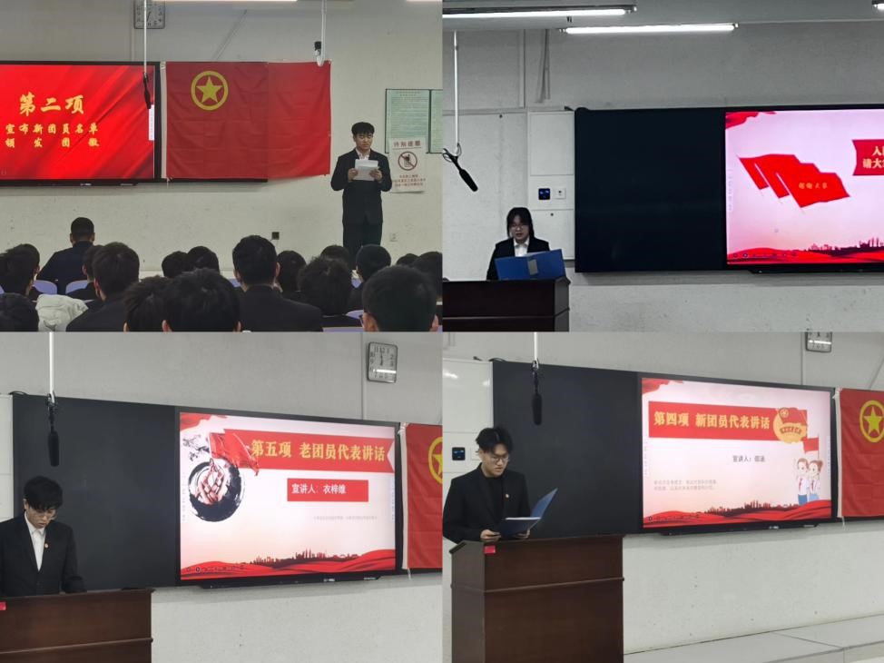 伴随着庄严肃穆的《中华人民共和国国歌》,入团宣誓仪式拉开序幕,与会人员全体起立,奏唱国歌。接着,学院团委副书记朱程俊宣读了新团员名单,并由优秀团员代表为全体新团员佩戴团徽,颁发团员证。随后,在优秀团员代表杨一格的领誓下,全体团员面向团旗,高举右拳,以饱满的精神面貌向团组织坚定表明为共产主义事业而奋斗的理想信念。随即,新团员代表邵涵、老团员代表衣梓维分别进行了发言,立志将按照团员标准严格要求自己,不仅要在组织上入团,更要在思想上、行动上入团,发挥榜样力量,弘扬青年担当。