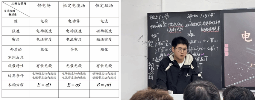 在课上崔家铭同学向同学们分享学习经验时说道:“电场与磁场的学习是不可分割的,不能只按部就班的按照顺序学习。我们如果将电场和磁场的性质进行归纳总结和对比,就会有不同的收获。比如矢量场的边界条件按照公式去记忆,会很麻烦。但是总结三种场的边界条件后,就会发现矢量场的边界条件具有共同的特性:密度法向连续,强度切向连续。这样就使得需要记忆的内容减少了很多。”