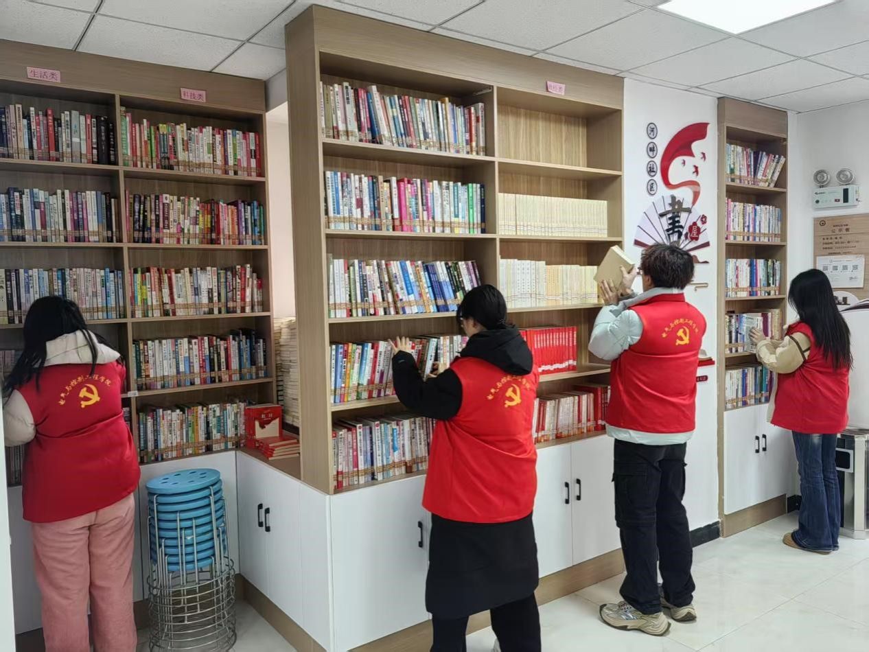 虽然天气寒冷,却丝毫阻挡不了志愿者们的热情。在社区工作人员的带领下,迅速投入工作。图书整理组将凌乱的书籍按照要求重新进行排序整理,使其更方便读者们查找借阅。志愿者们还将柜台上不同色标的图书按照类别找到对应的书架,将其归位。卫生清理组他们手持扫帚、铲子、垃圾袋等工具,对社区道路、绿化带、楼道内小广告等区域进行全面清理。