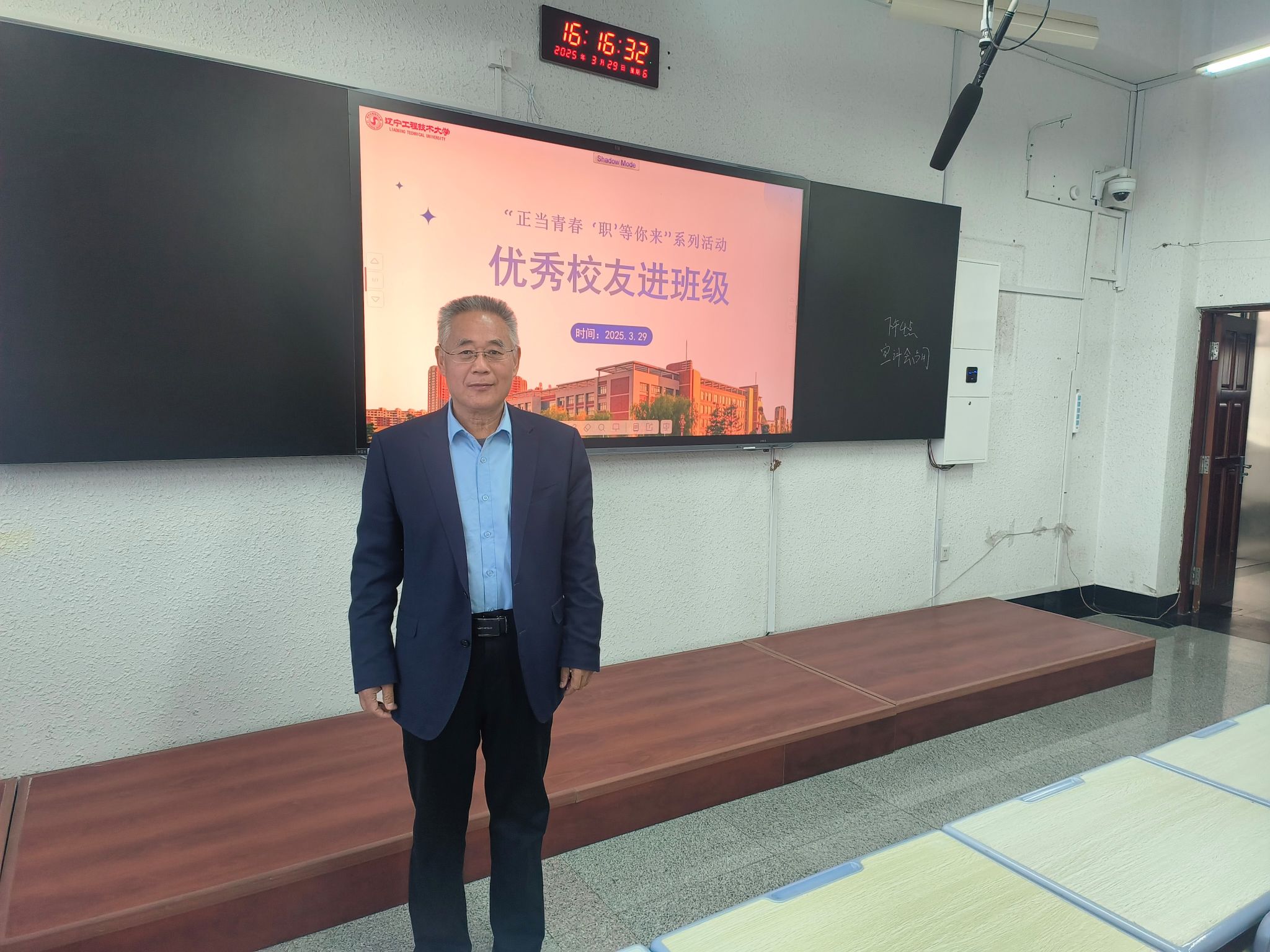 于静远205教室举办了“优秀校友进班级”活动,本次活动聚焦学生职业发展需求,特别邀请到煤矿电气工程专业80级校友,博士生导师,天津恒一机电科技有限公司负责人苗长云担任主讲。活动由爱爱视频