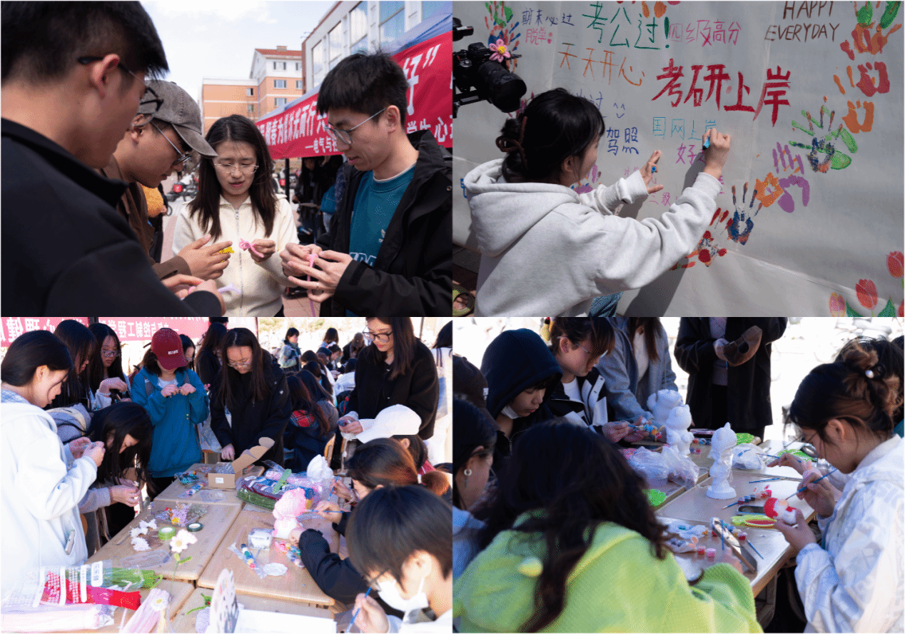 本次活动由“绘梦石膏坊”以色彩疗愈心灵,“拾花映扇集”让诗意绽放指尖,“暖绒心驿站”编织温暖记忆,“笺语传情阁”搭建心灵桥梁,“纤丝织锦间”牵引情感脉络,“柔塑释压舱”塑造轻松时光,六个心理活动板块组成。活动现场热闹非凡,学生们三五成群,簇拥在各展台前,以笔墨抒怀生活情谊,借扭扭花绽放对未来幸福生活的美好期许。