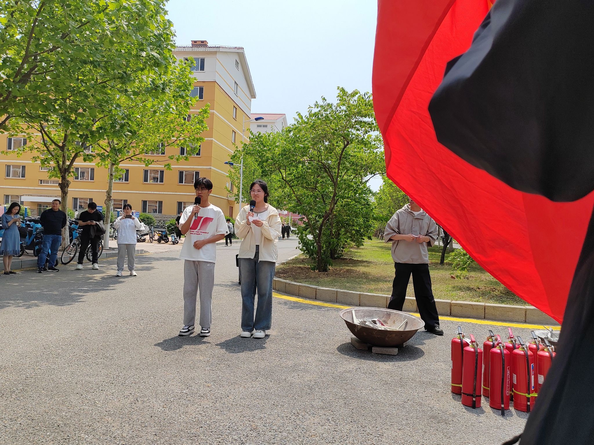 在消防器材讲解环节,校区保卫处老师详细介绍了灭火器和消防栓的使用方法,并进行了现场示范。师生们认真聆听,积极互动,多名同学在老师的指导下,亲自操作灭火器和消防栓,掌握了消防器材的规范使用方法。