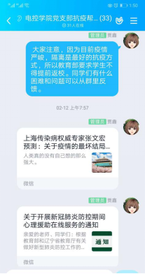 电控学院团委开展线上主题团日活动。号召学生干部不忘肩上重任,积极配合老师完成疫情防控宣传工作,充分利用信息媒介开展学生工作。
