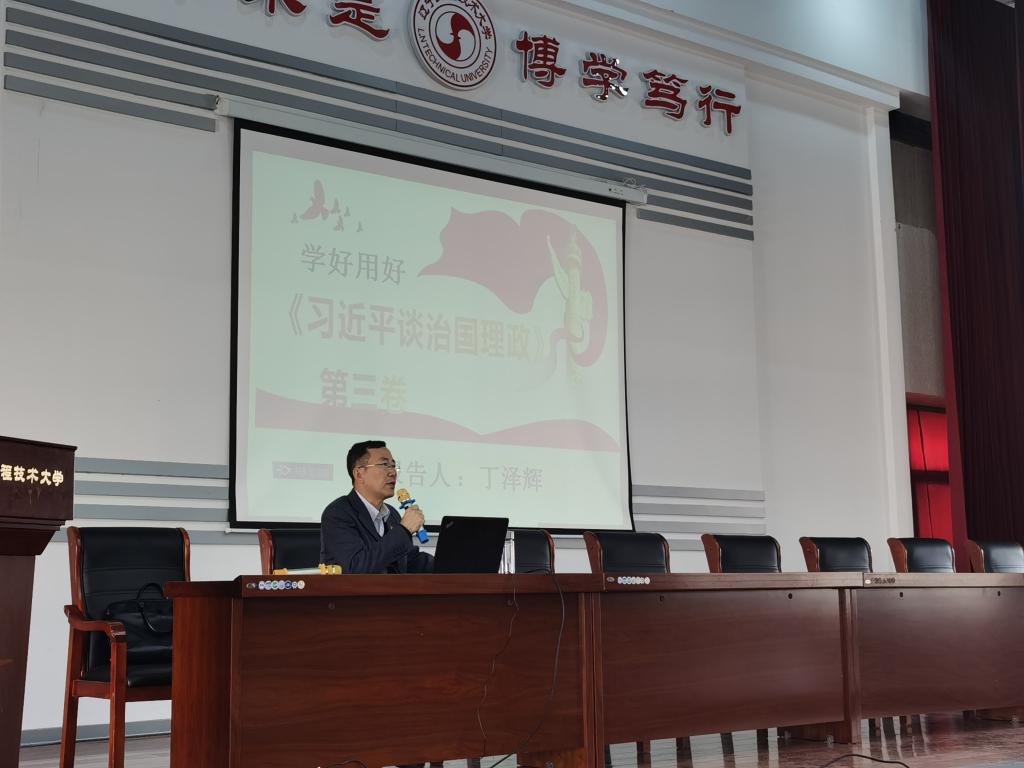 邀请葫芦岛市委党校丁泽辉老师为全院党员师生宣讲《习近平谈治国理政》第三卷精神内涵。宣讲会由党委书记田国胜主持。