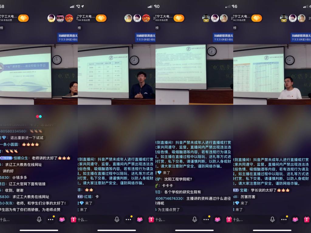 各专业系主任侯利民老师、王巍老师、徐耀松老师、刘春喜老师、闫孝姮老师在现场参加了本次会议,会议由学院就业辅导员程千主持,此外全院千余名师生、家长通过抖音直播参与了本次分享会。