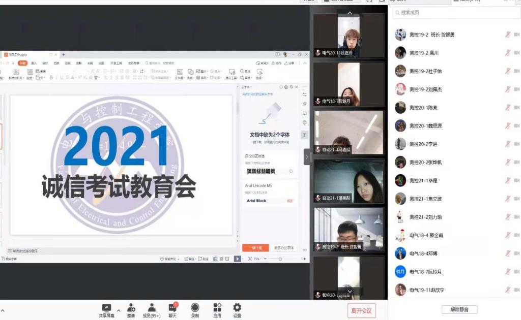 在全国大学生英语四六级考试和期末考试即将来临之际,为了严肃考风考纪,形成良好的学习之风,12月18日晚,电控学院在线上举行了诚信考试教育大会。此次会议由学院大学生学习与发展指导中心主任张驰老师主持,各班班干部在线上认真聆听。