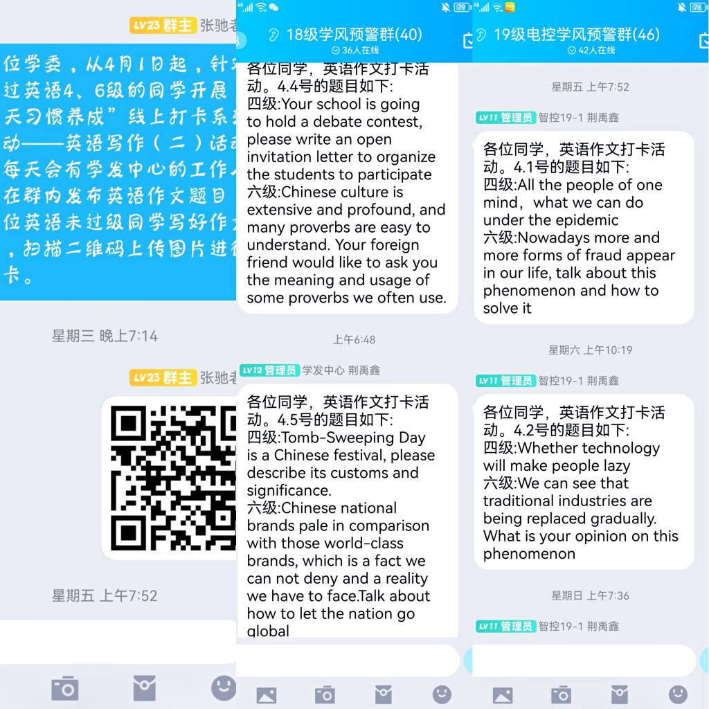 学发中心的工作人员每日定时向QQ群中布置英语作文题目,并督促同学们将完成的英语作文上传到打卡云平台。部分同学结合自身情况做出了更高的要求,BBC听力、雅思写作等内容时有出现,对其他同学起到很好的激励效果。