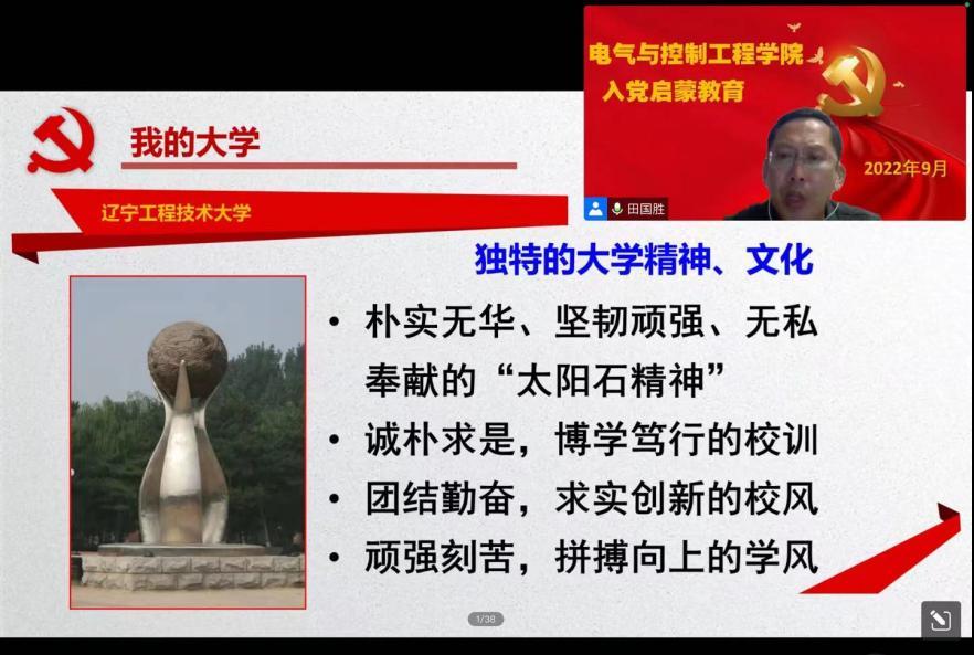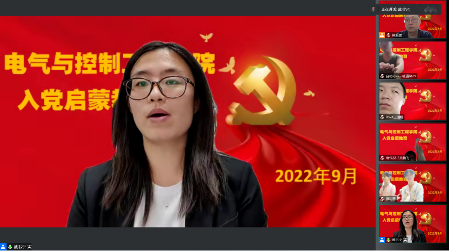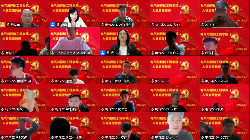 在腾讯会议线上召开2022级新生入党启蒙教育大会。学院党委书记田国胜,学院党委副书记、学生第一党支部书记贾鑫,学生第二党支部书记施振雷,学生第三党支部书记武书宁,全体2022级副班导师以及669名新生参加会议。