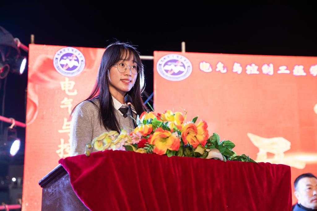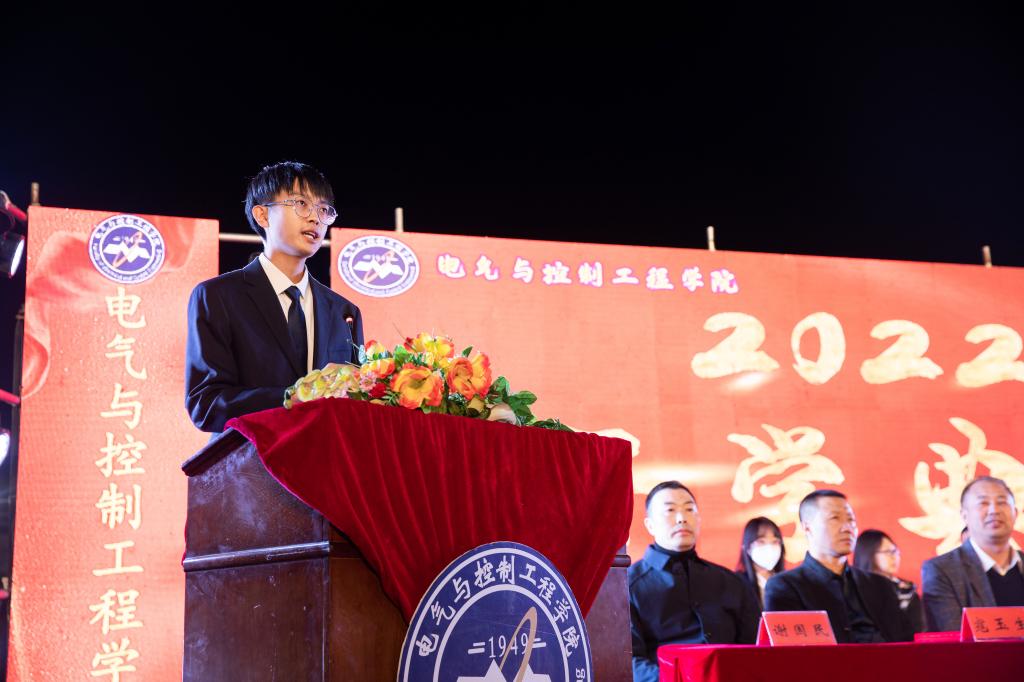 在校生代表电气20-6班刘东鑫同学发言,他讲授了自己的学习方法与宝贵经验。电气22-6班姚子研作为新生代表发言,畅谈了自己对大学生活的憧憬,用热血与汗水,铸就无悔的青春。