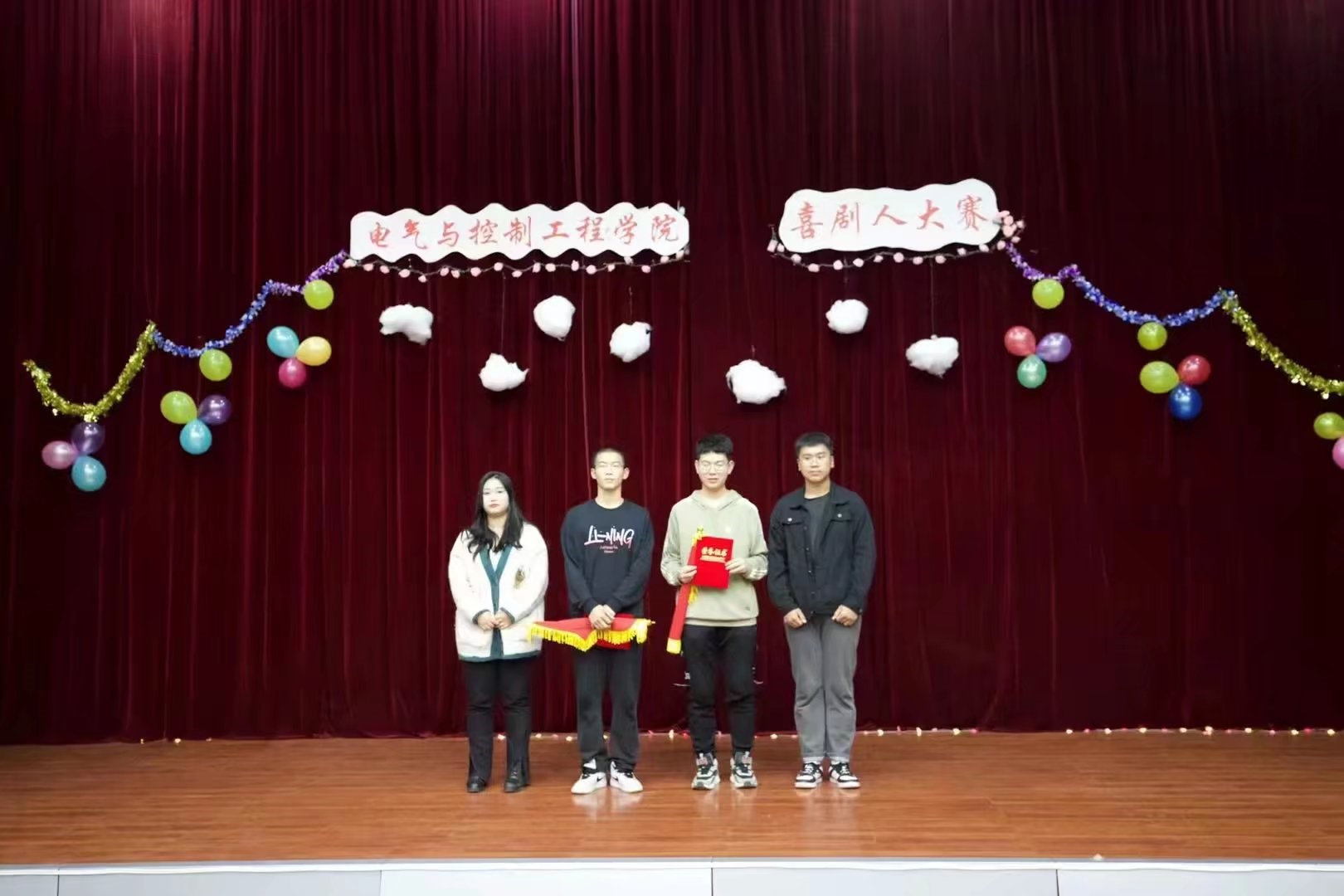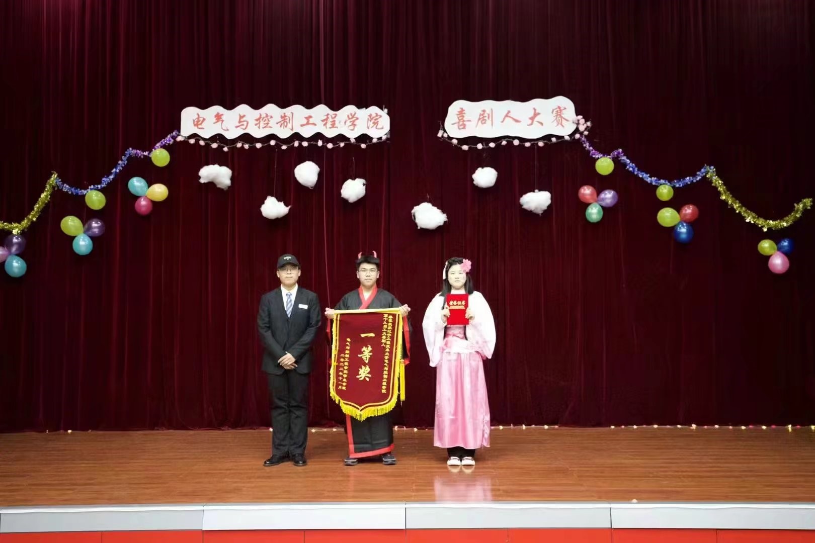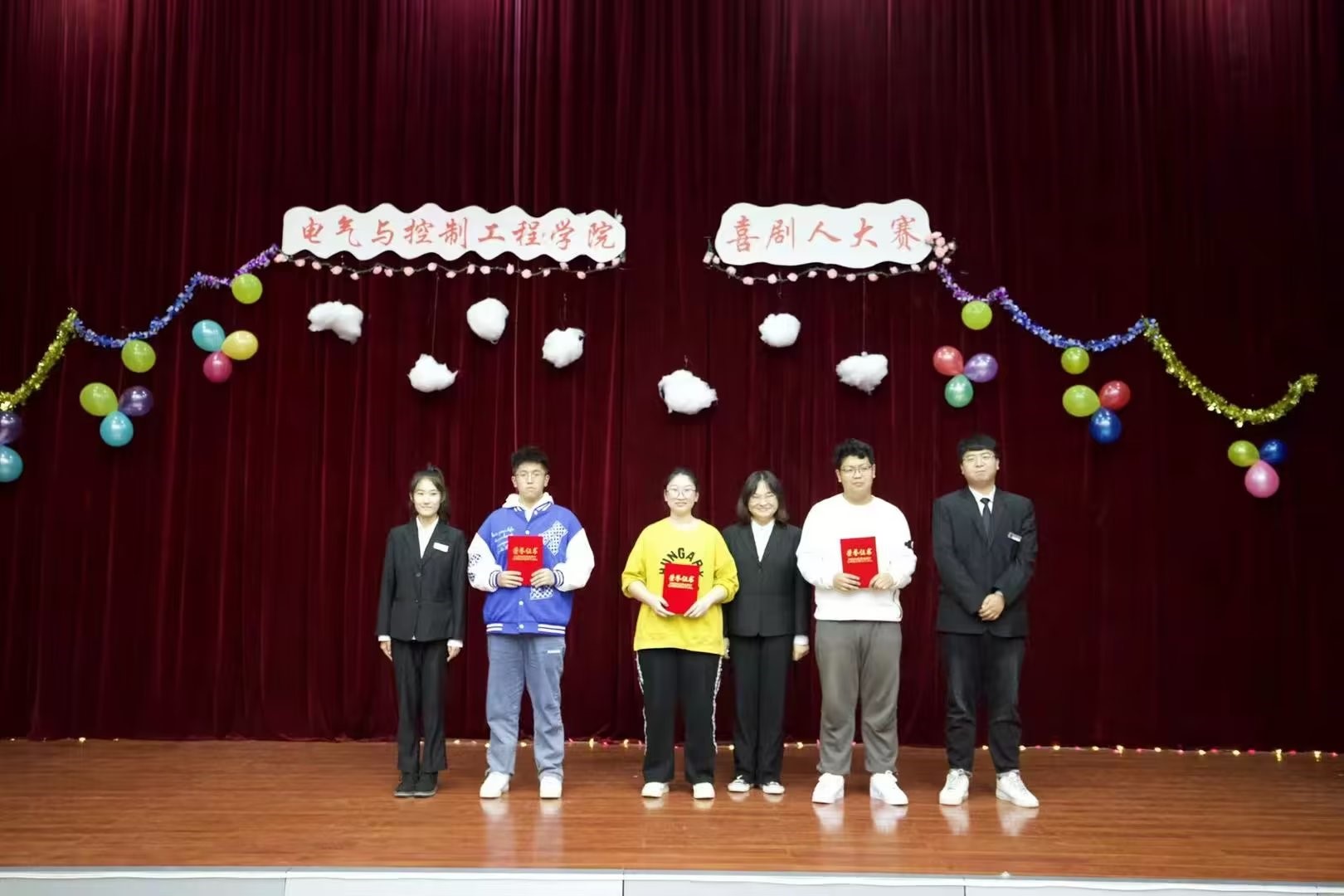 经过激烈的竞争与比拼,由在场评委打分选出的一、二、三等奖获得者已然诞生。颁奖环节正式开始。获得一等奖的是电气22-2班。获得二等奖的是自动22-2班和智控22-1班。获得三等奖的是自动22-3班,电气22-1班和电气22-5班。张炜同学获“最佳男主角”称号。李维怡同学获“最佳女主角”称号。