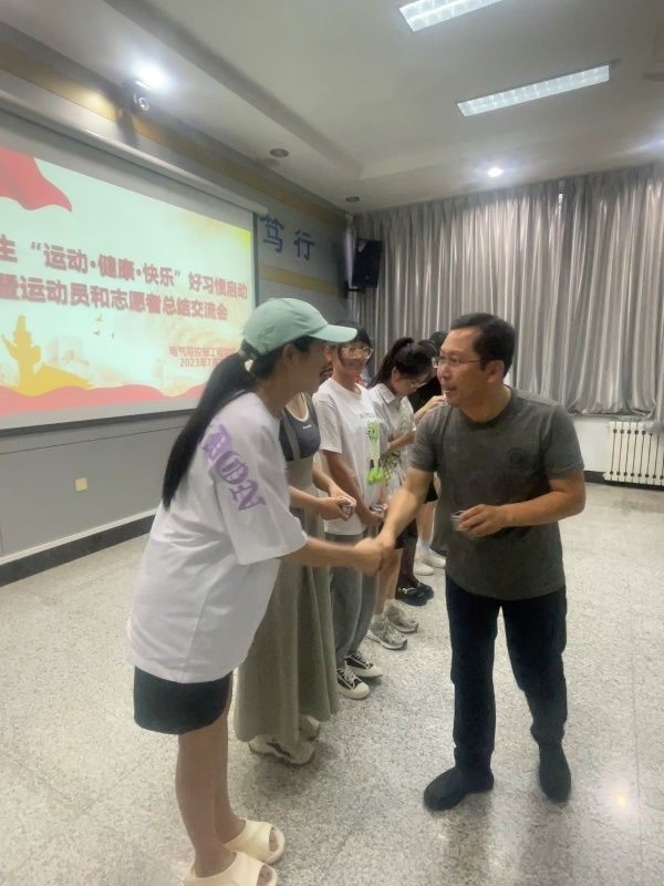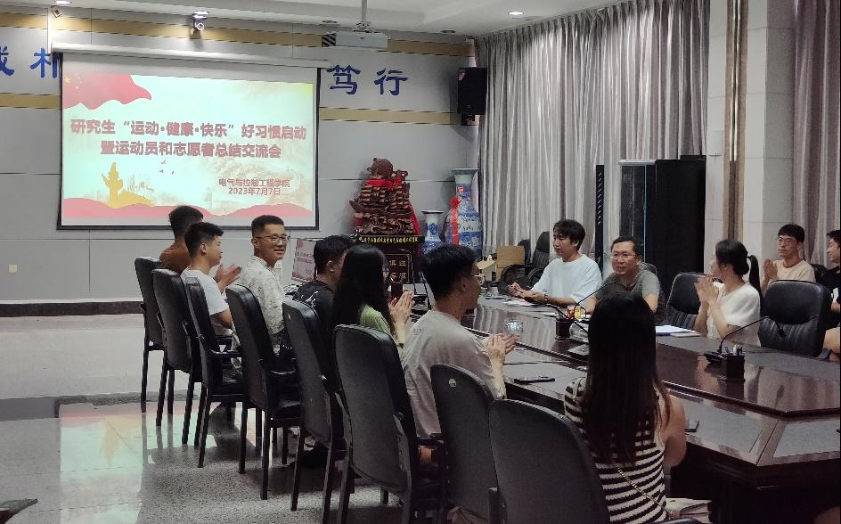 研究生‘运动·健康·快乐’好习惯启动暨运动员和志愿者总结交流会”。会议由学院研究生辅导员王一方老师主持,学院党委书记田国胜、辅导员杨姝航老师及运动员、志愿者学生参加会议。