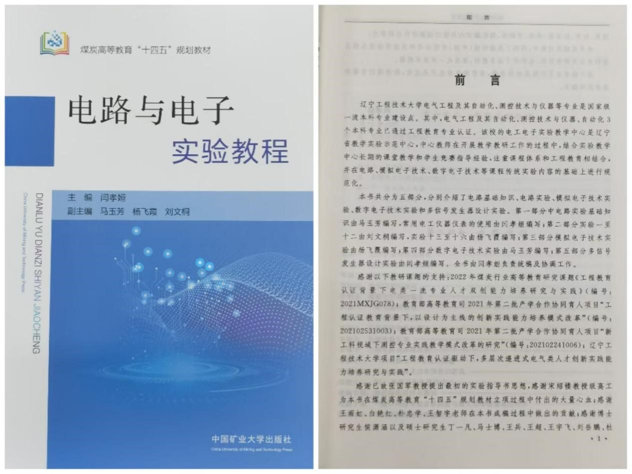 (通讯员 刘文桐)2024年5月,电工电子实验教学中心自编煤炭高等教育“十四五”规划教材——《电路与电子实验教程》正式出版发行。教材由副院长闫孝姮主编,实验中心主任马玉芳,教师杨飞霞,刘文桐副主编。新教材的出版发行有着继往开来的重要意义,标志着爱爱视频