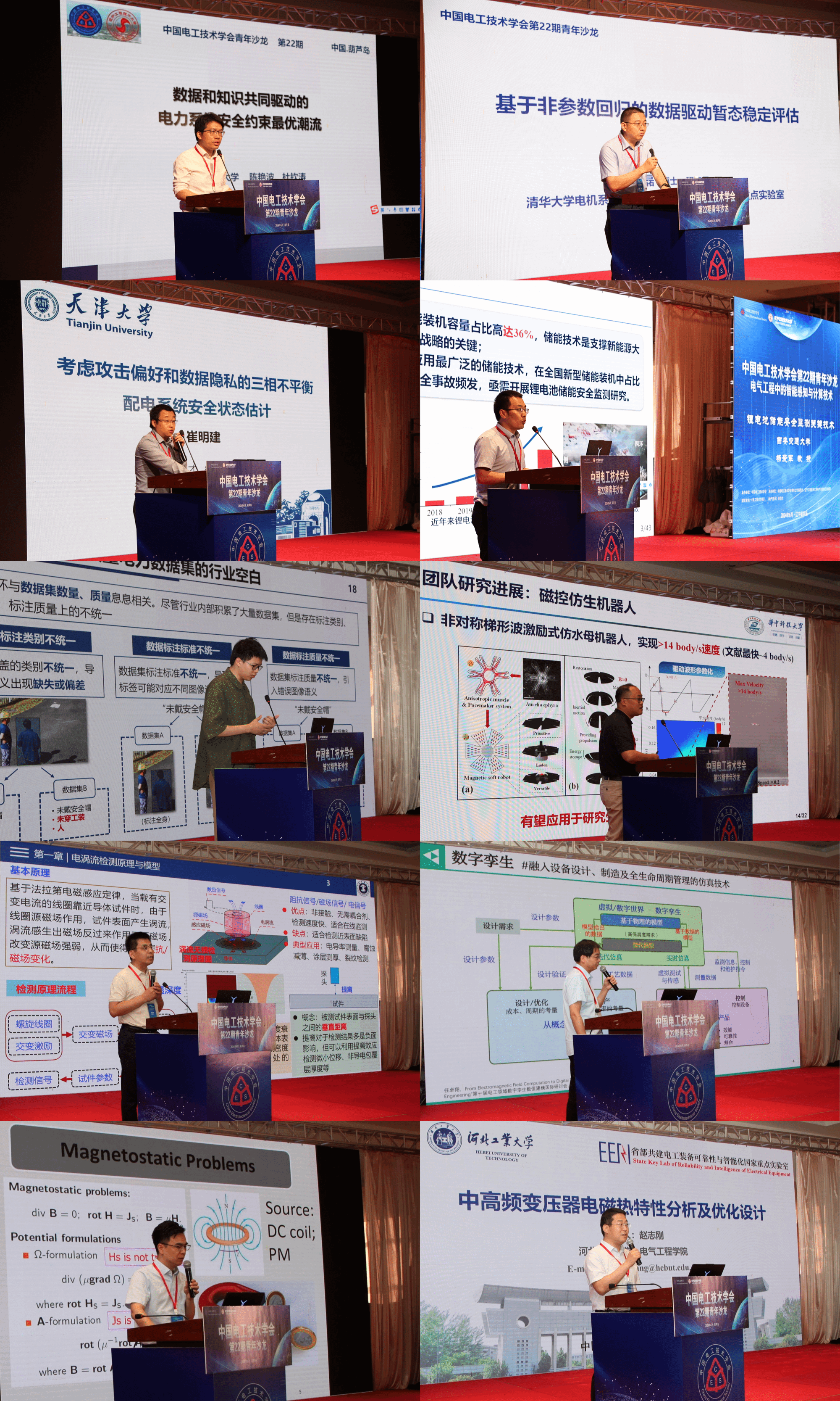 兼职博导、清华大学陈磊研究员分享了“基于非参数回归的数据驱动暂态稳定评估”,国家级青年人才、华北电力大学陈艳波教授分享了“数据和知识共同驱动的电力系统安全约束最优潮流”,海外优青、天津大学崔明建教授分享了“考虑攻击偏好和数据隐私的三相不平衡配电系统安全状态估计”,国家级青年人才、西安交通大学杨爱军教授分享了“锂电池储能安全监测关键技术”,浙江大学邓以恒博士生分享了“电力大模型的关键技术”,中国科协青年托举人才、华中科技大学曹全梁教授分享了“磁控软体机器人技术及其应用”,江苏省六大高峰人才、中国矿业大学范孟豹教授分享了“电涡流检测多绕组新变压器”,中科院电工研究所徐小宇副研究员分享了“数字孪生场景中的电磁计算替代建模研究”,国家级青年人才、武汉大学赵彦普教授分享了“基于有限元方法的电机及变压器仿真分析技术”,河北省三三三人才、河北工业大学电气工程学院副院长赵志刚教授分享了“中高频变压器电磁特性模拟研究”,并与参会人员进行探讨交流。
