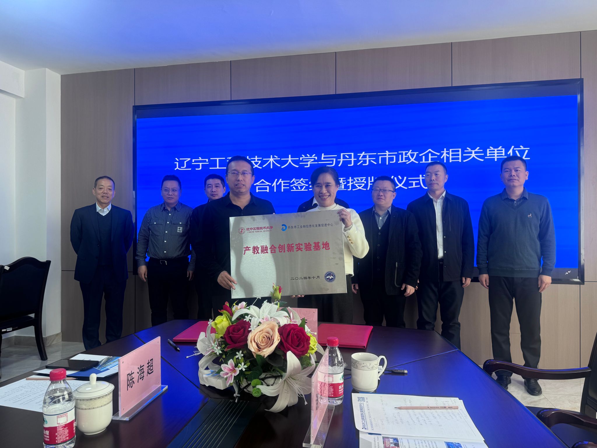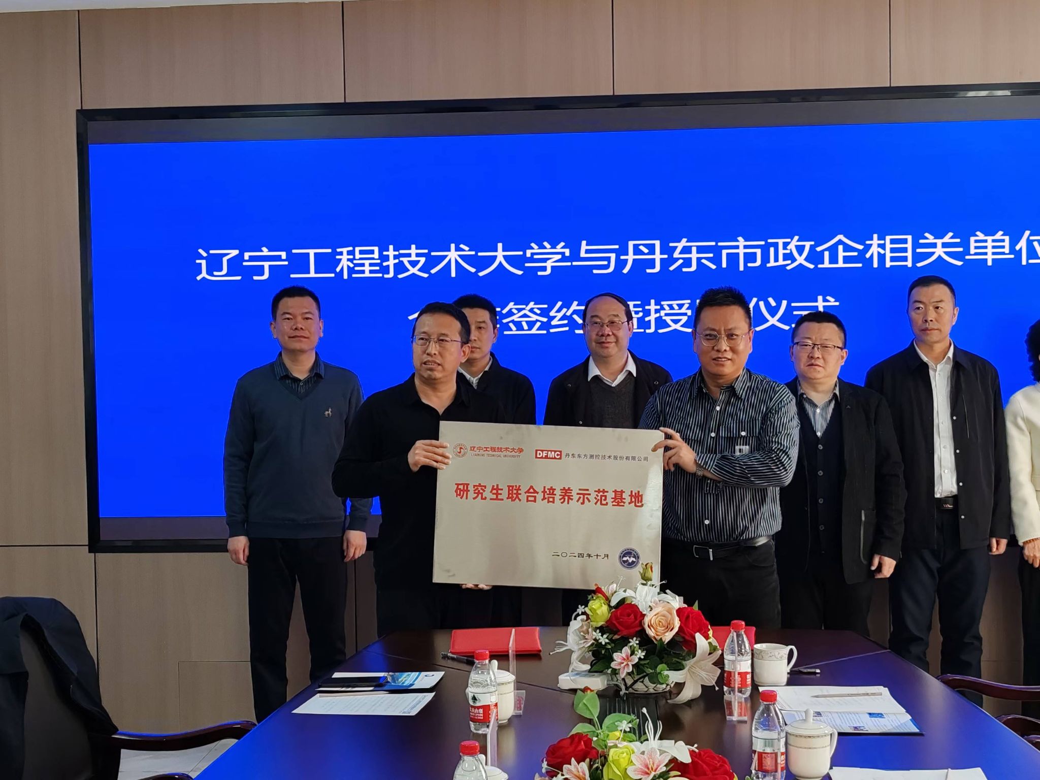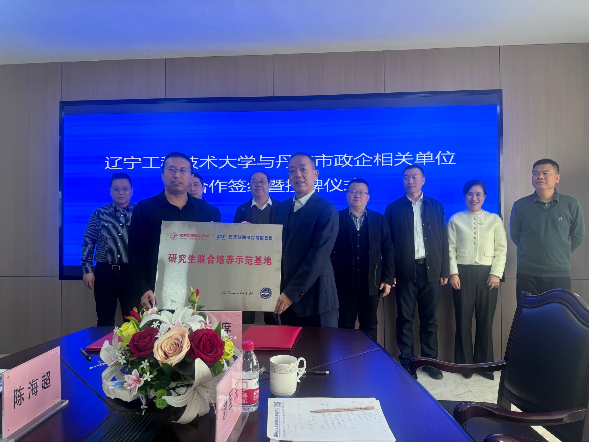的历史沿革、办学理念、师资队伍、学科建设、科研成果转化、人才培养等方面的情况;邱云飞主任介绍了学校研究生教育、产学研基地建设等情况。丹东华通测控有限公司刘海波总经理、丹东东方测控技术股份有限公司樵永锋副总经理分别介绍了企业发展定位、相关行业业绩、产品特色等,并期望未来能在研究生联合培养、科技创新等方面开展深度合作。丹东市工业和信息化局宋菲副局长介绍了丹东市工业中小企业发展等方面工作,期待辽工程在后续针对服务中小企业发展提供助力。期间大家就合作模式、科技攻关方向、人才培养途径等方面进行了深入沟通探讨。随后彭继慎代表学院与丹东市工业和信息化发展促进中心签约建立产教融合实验基地,与丹东东方测控技术股份有限公司、丹东华通测控有限公司两家企业签约建立研究生联合培养示范基地,邱云飞代表学校参加授牌仪式。
