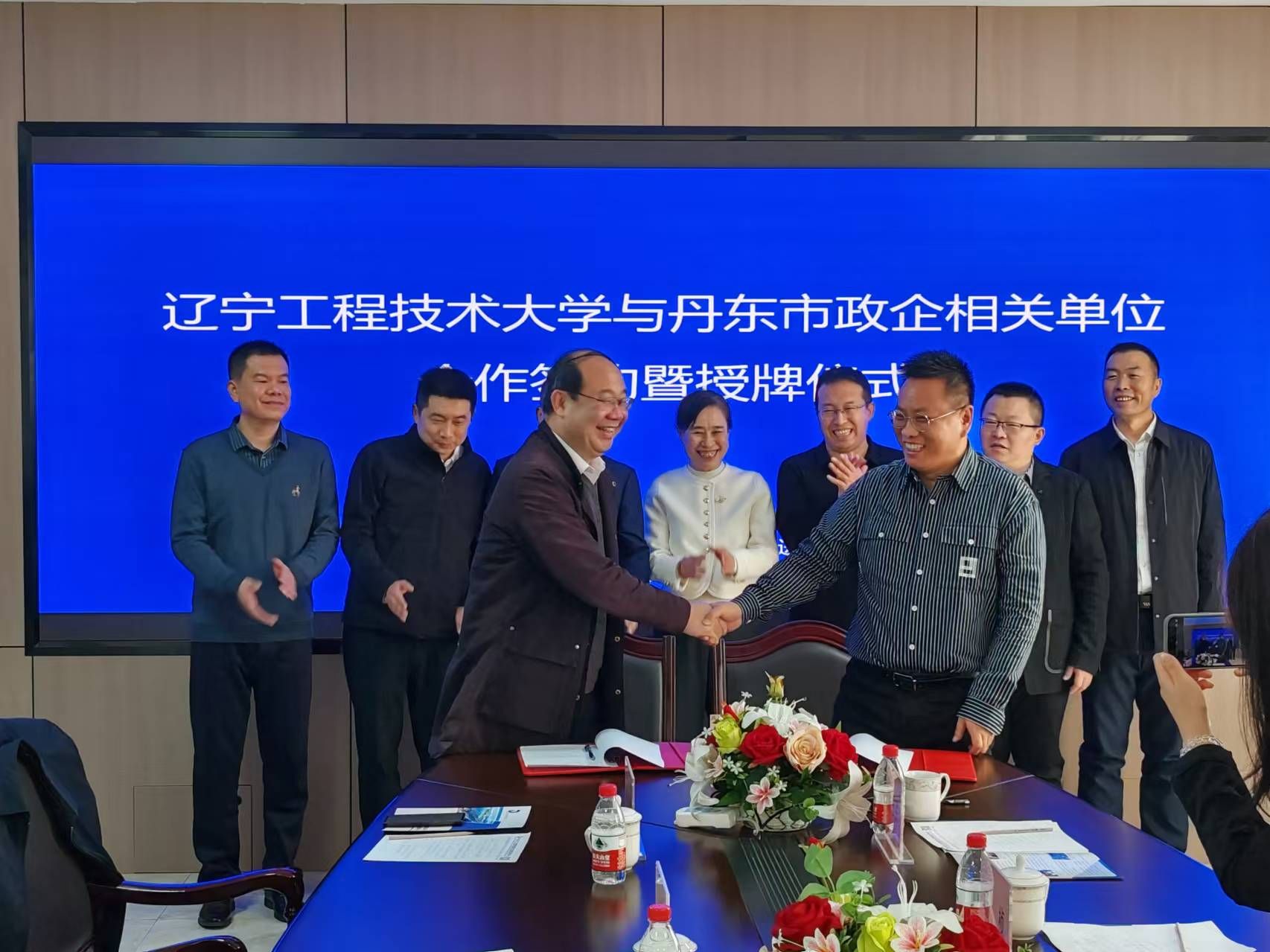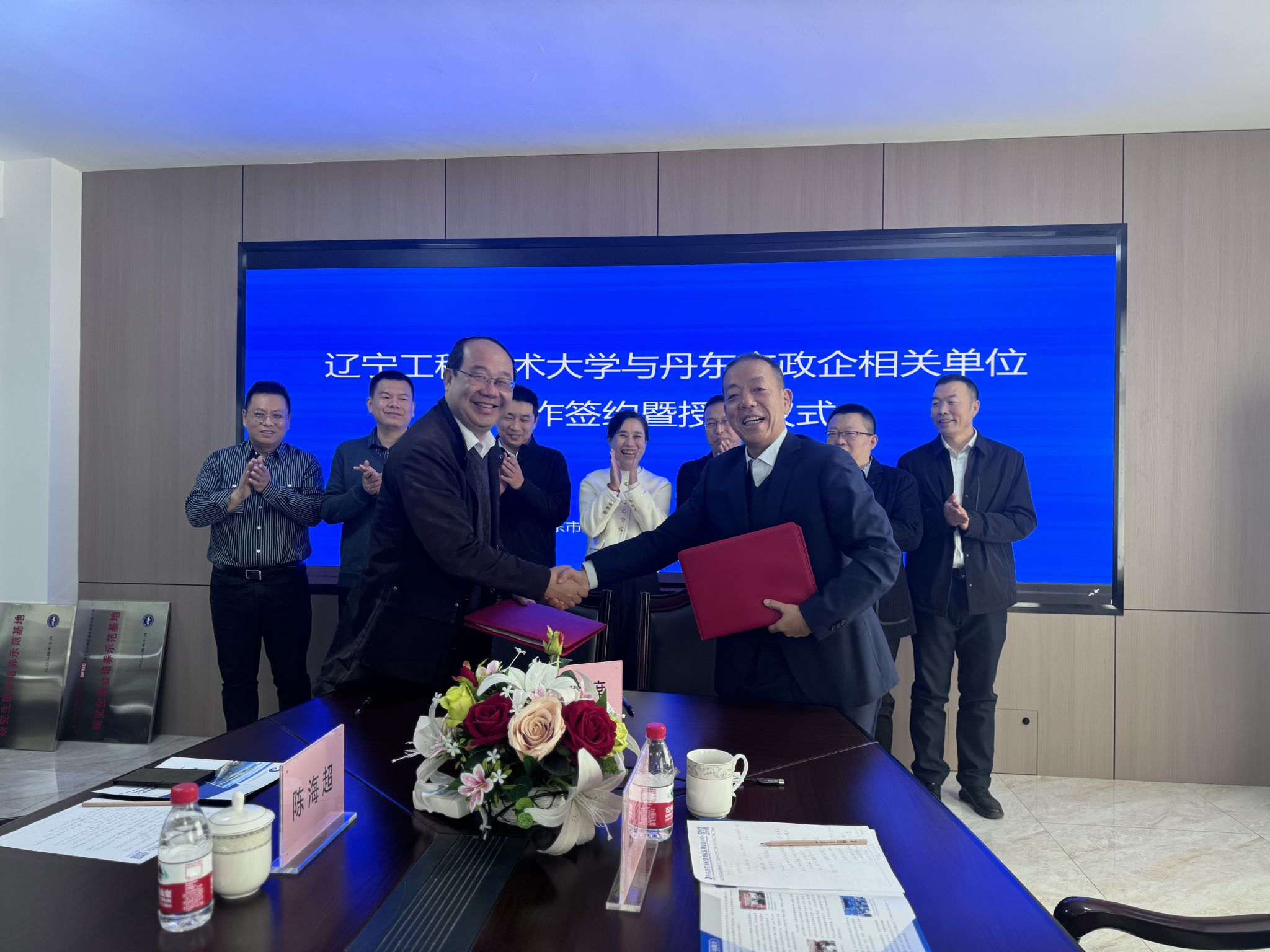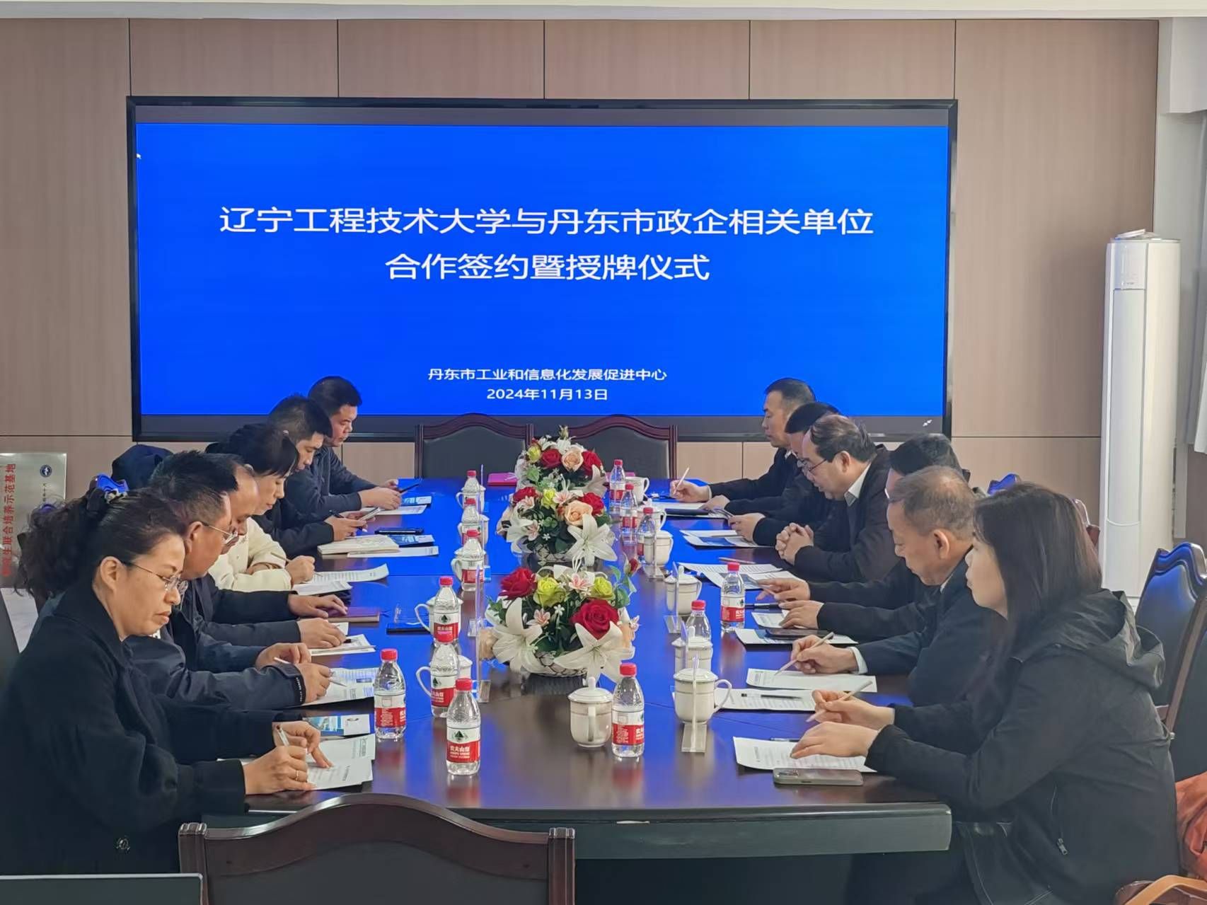的历史沿革、办学理念、师资队伍、学科建设、科研成果转化、人才培养等方面的情况;邱云飞主任介绍了学校研究生教育、产学研基地建设等情况。丹东华通测控有限公司刘海波总经理、丹东东方测控技术股份有限公司樵永锋副总经理分别介绍了企业发展定位、相关行业业绩、产品特色等,并期望未来能在研究生联合培养、科技创新等方面开展深度合作。丹东市工业和信息化局宋菲副局长介绍了丹东市工业中小企业发展等方面工作,期待辽工程在后续针对服务中小企业发展提供助力。期间大家就合作模式、科技攻关方向、人才培养途径等方面进行了深入沟通探讨。随后彭继慎代表学院与丹东市工业和信息化发展促进中心签约建立产教融合实验基地,与丹东东方测控技术股份有限公司、丹东华通测控有限公司两家企业签约建立研究生联合培养示范基地,邱云飞代表学校参加授牌仪式。