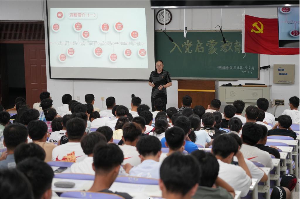 本次教育以“青春心向党,奋进新征程”为主题,主讲教师将爱国教育、专业教育、校史教育与入党启蒙教育有机融合,以“大学生为什么要入党”为切入点,围绕端正入党动机,从申请入党的基本条件、党的基础知识等内容多维度进行了介绍,增强了入党启蒙教育的实效性和感染力。在交流互动环节,授课教师耐心地为新生答疑解惑,并结合大学学习、生活和工作的特点给予新生建议,帮助新生明确奋斗目标,适应大学生活,开启筑梦之旅。