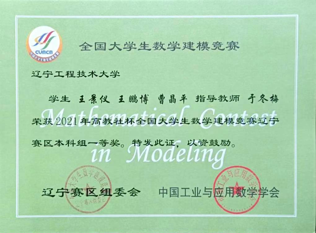 的校训,也是她进入大学以来恪守的准则。进入大二学年后,开始接触到各种专业课如《电路》、《电磁场》等,学习难度上升,成绩有些许下滑。她更潜心研究,专心学习,在大二学年仍保持专业第一的成绩。在学习巩固专业知识的同时,她也注重实践方面的锻炼。通过班导师刘艳丽组织的竞赛讲座,激发了她对数学建模比赛的兴趣。万事开头难,只要肯攀登。第一次参加的辽宁省数学建模竞赛石沉大海,太阳石精神“坚韧顽强”鼓励着她,终于在经过几次锻炼后,她获得了全国大学生数学建模竞赛辽宁赛区本科组一等奖,还获得了“华数杯”全国大学生数学建模竞赛三等奖、全国大学生数学建模竞赛省三等奖、亚太杯三等奖。