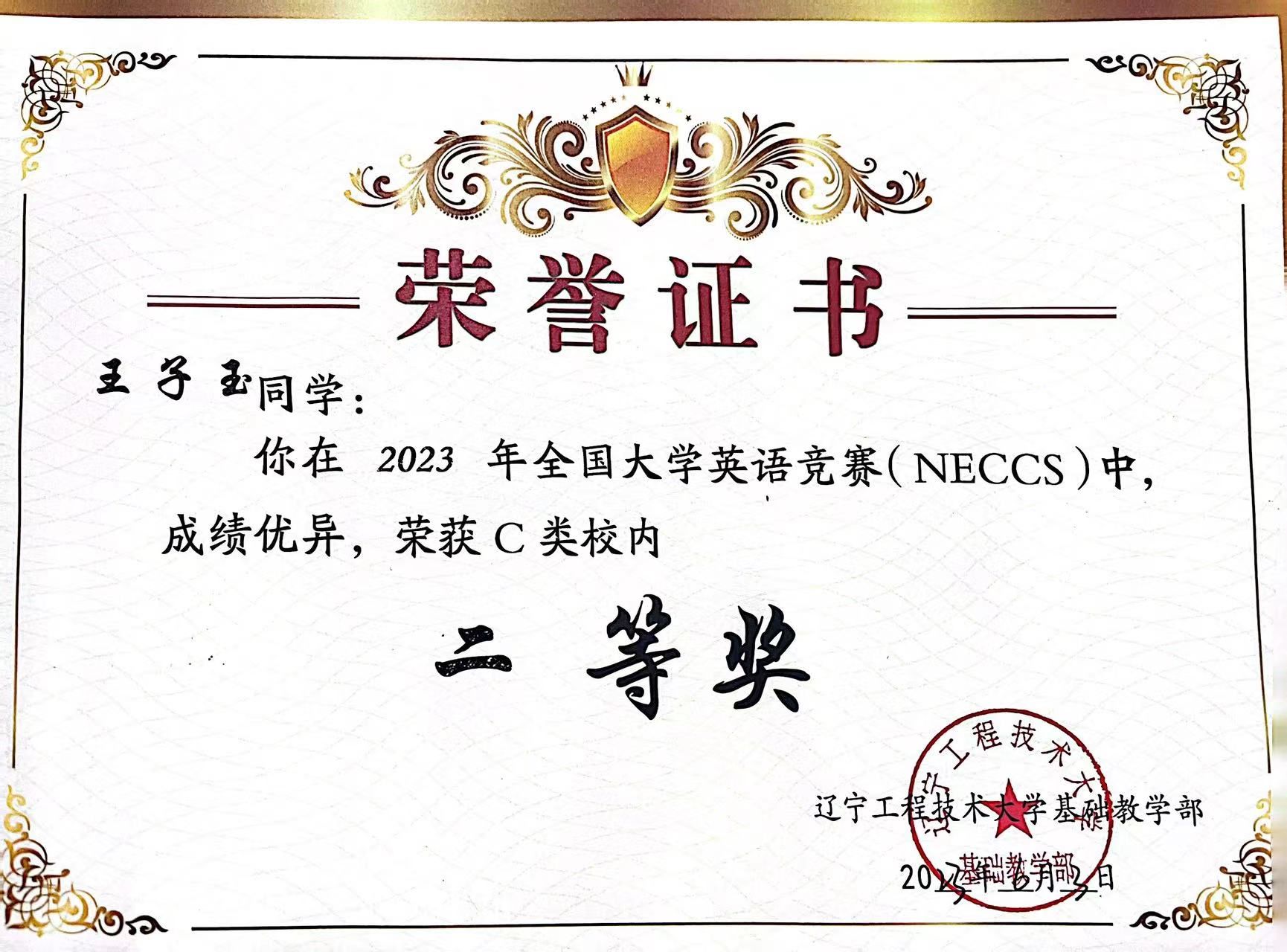 奖学金类:校一等优秀学生奖学金2次,校二等奖学金优秀学生奖学金1次,辽宁省政府奖学金,累计获得国家、省、校级奖项4项。