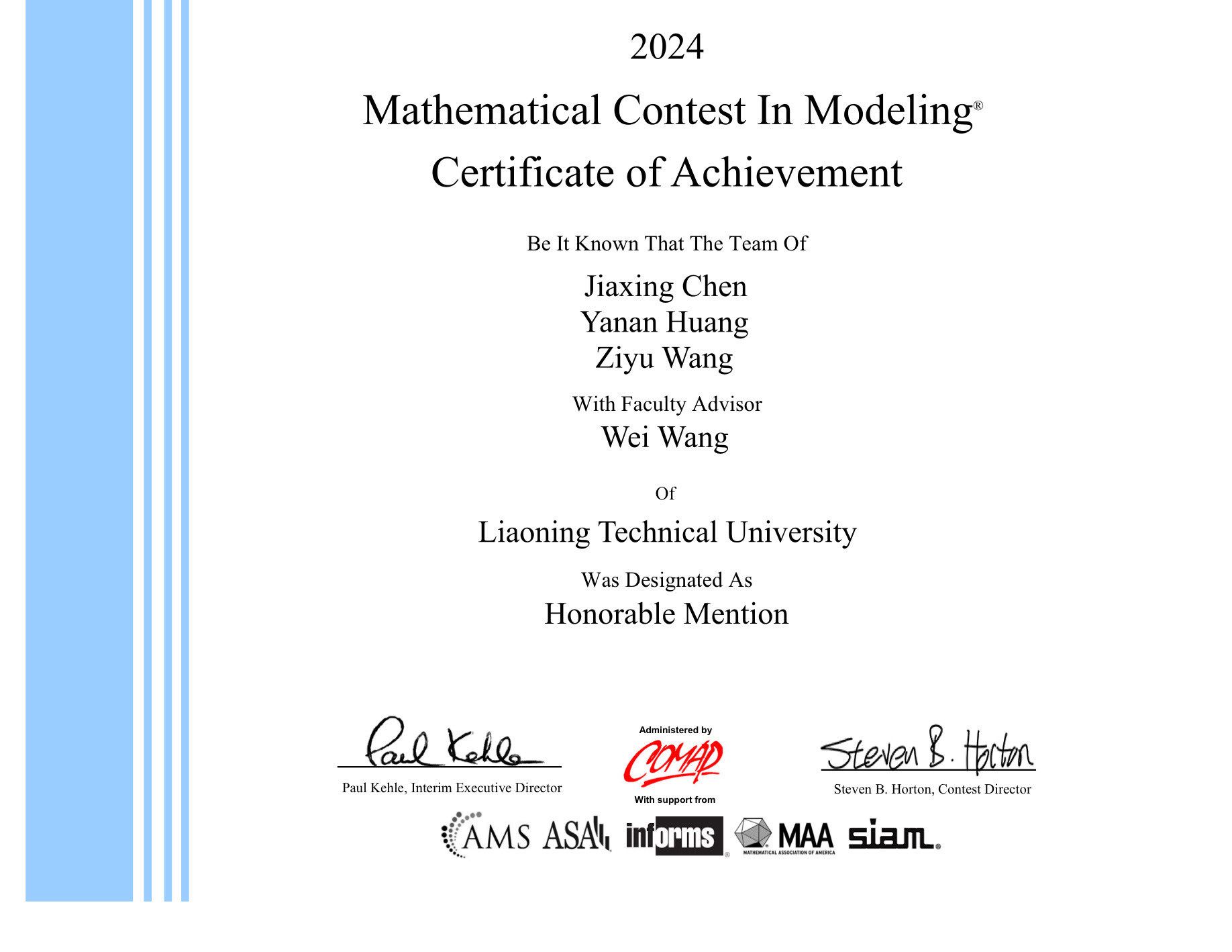 1 美国大学生数学建模竞赛 奖项:国家级Honorable Mention(H 奖) 指导教师:王伟