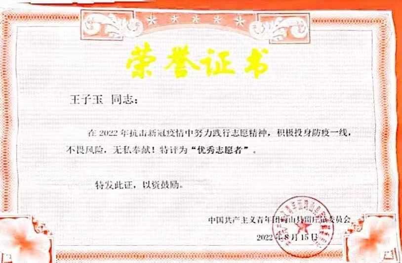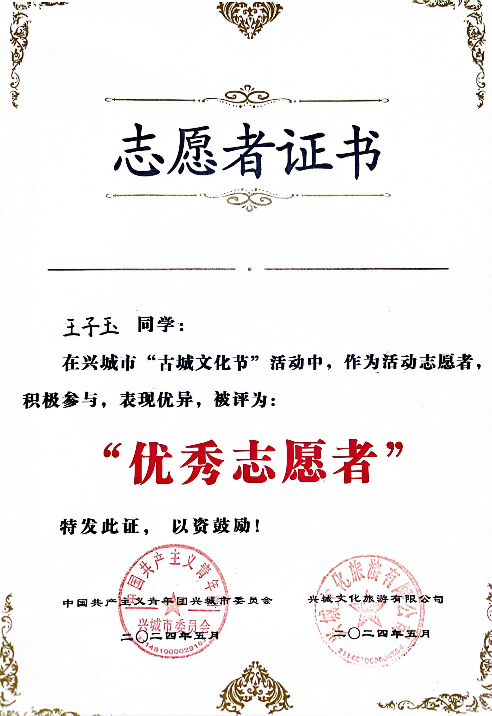 社会实践类:2022年,参加2022年抗击新冠疫情志愿活动,获得“优秀志愿者”荣誉称号;2023年,参加校运动会团体操志愿活动,获得突出贡献奖;2023年,参加学霸联盟志愿活动,获得“优秀志愿者”荣誉称号;2024年,参加兴城市“文化节”志愿活动,获得“优秀志愿者”荣誉称号。