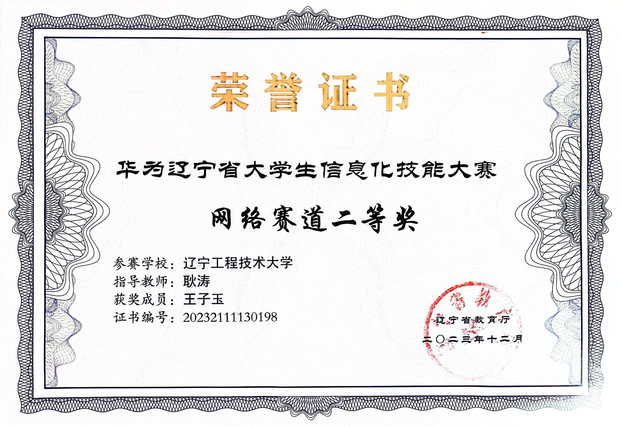5 华为辽宁省大学生信息技能化大赛 奖项:省级“网络赛道”二等奖 指导教师:耿涛