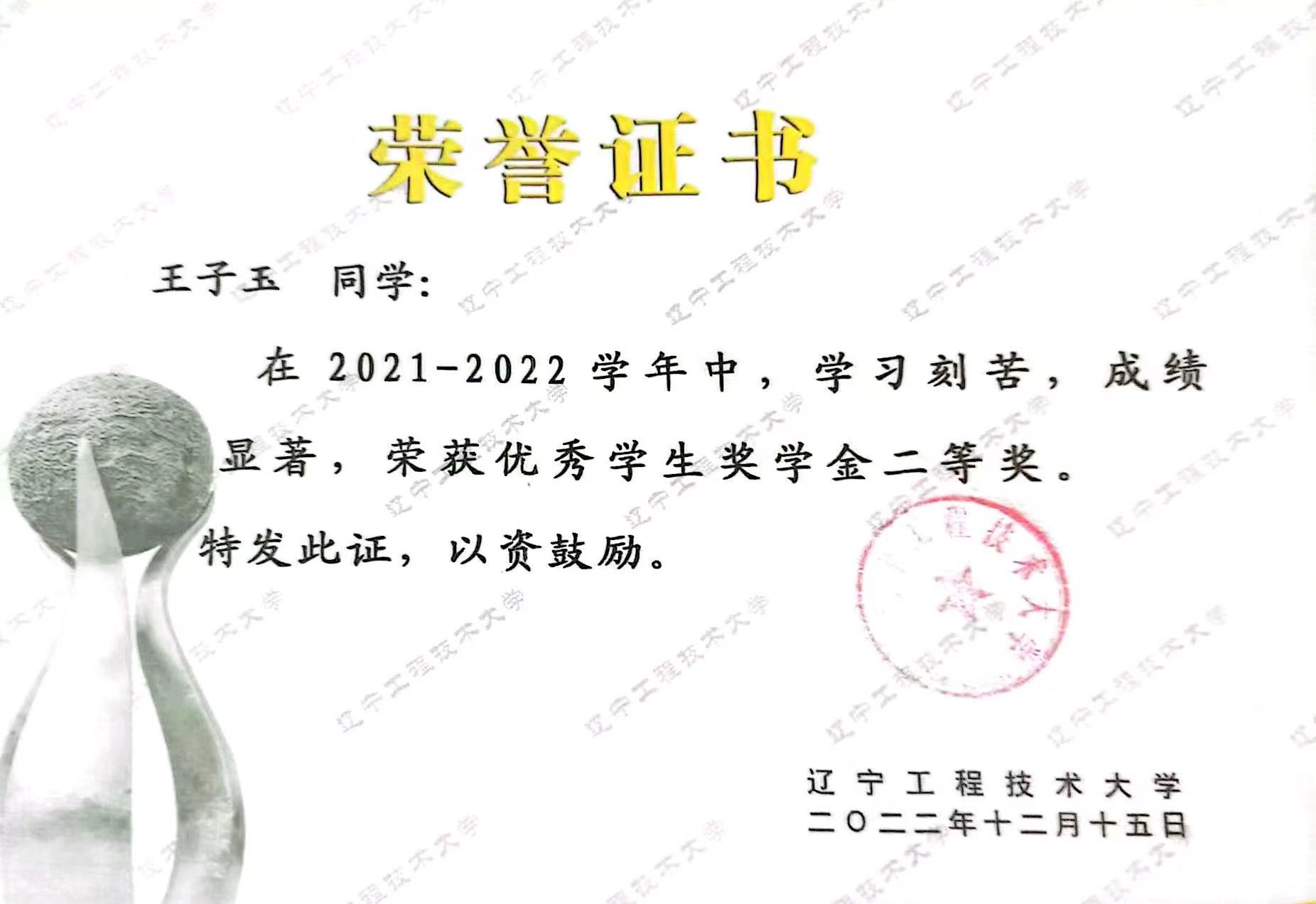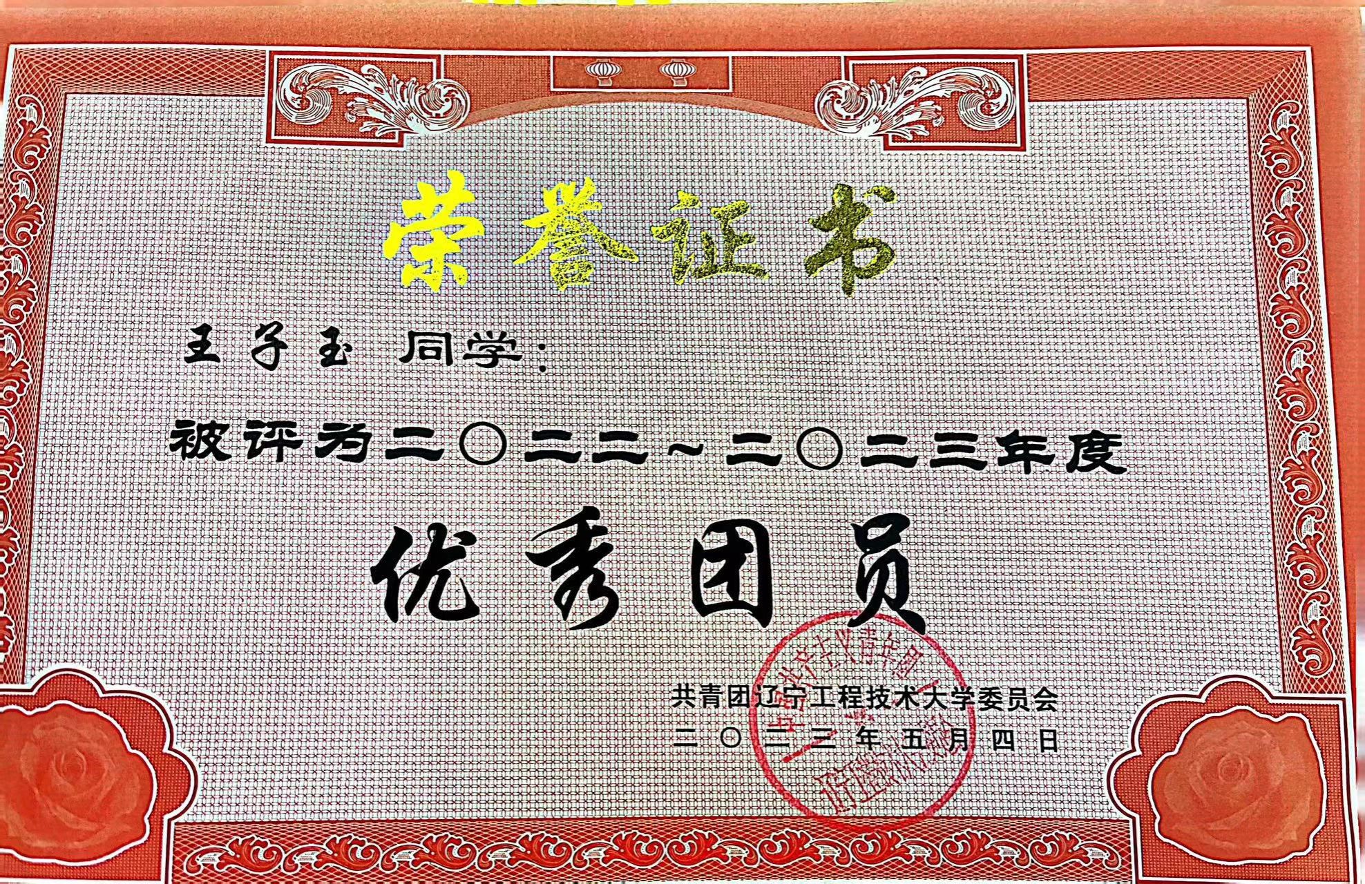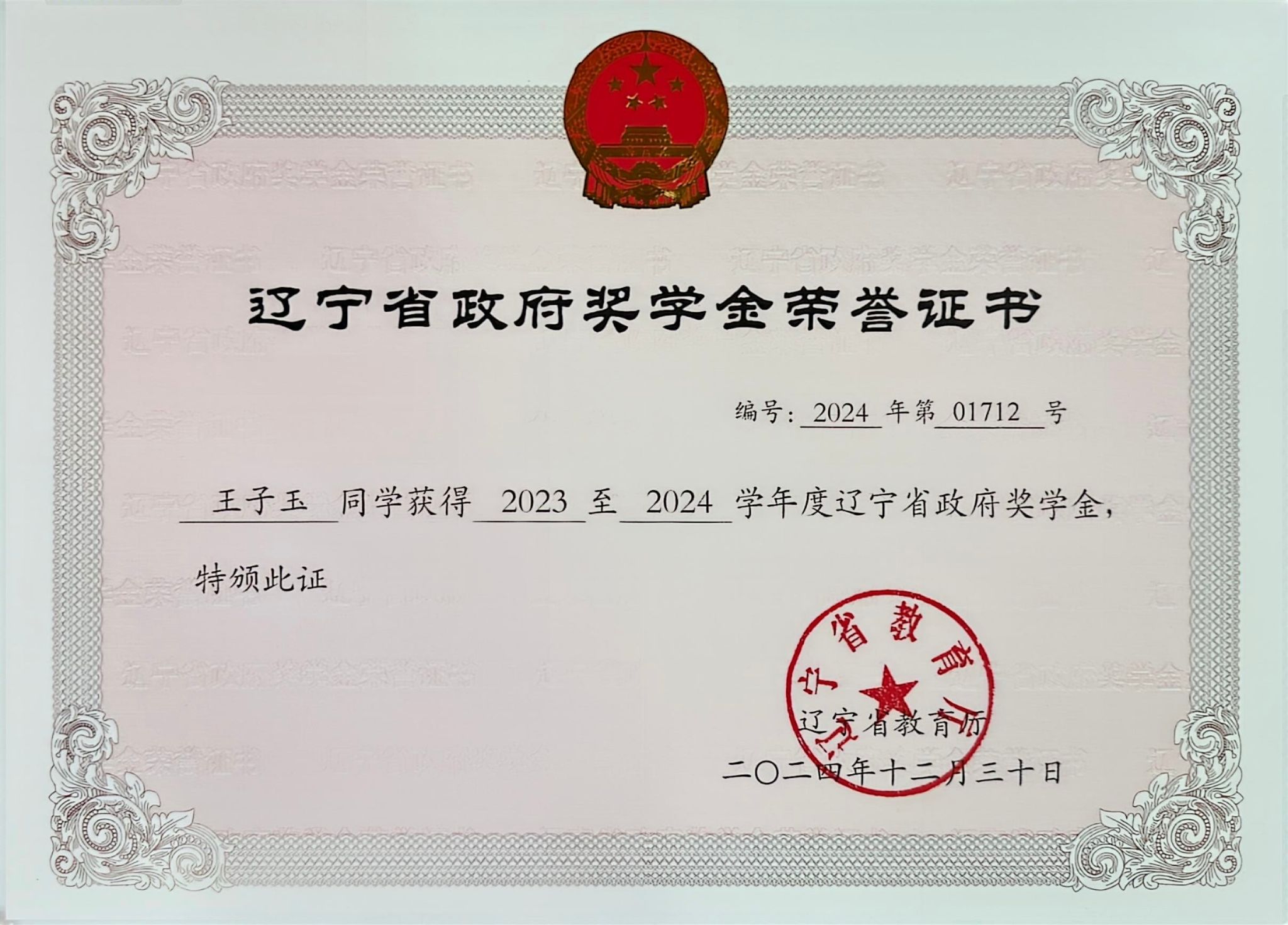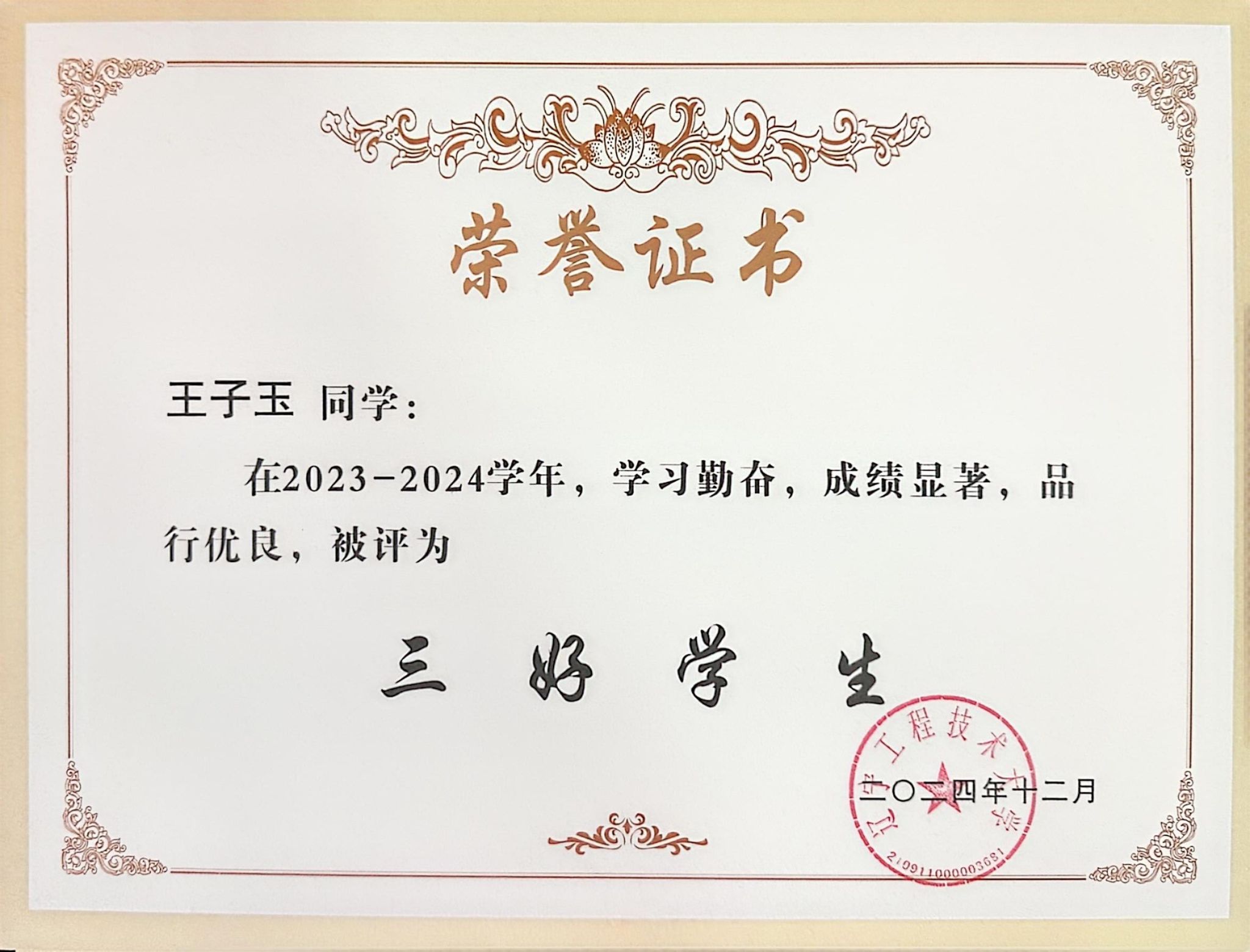 其他类:2023年,获得 “三好学生”荣誉称号;2023年,获得 “优秀团员”荣誉称号;2024年,获得 “三好学生”荣誉称号;2024年,获得 “进步之星”荣誉称号;2024年,获得 “辽宁省普通高等学校优秀毕业生”荣誉称号。