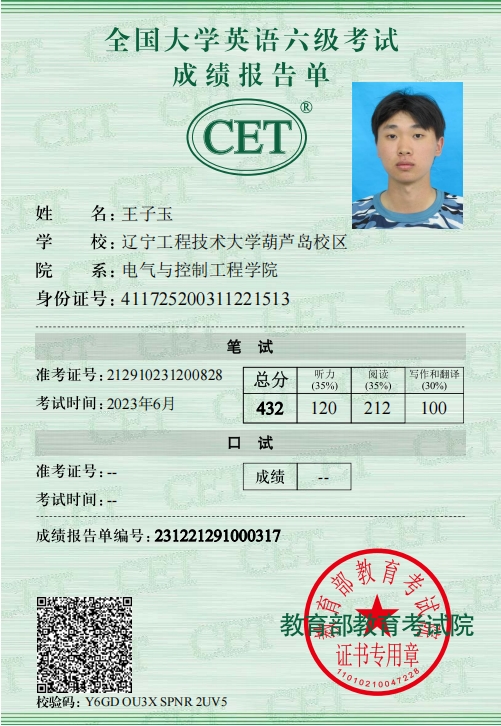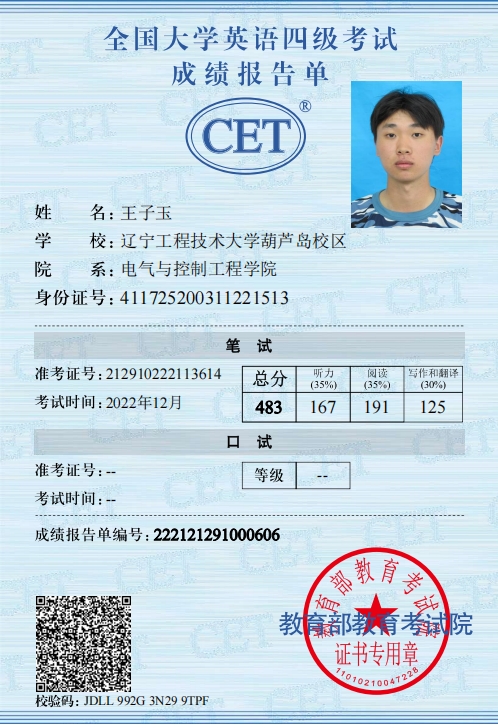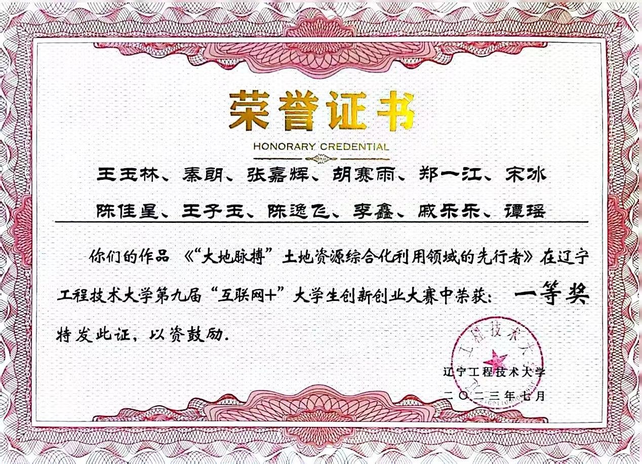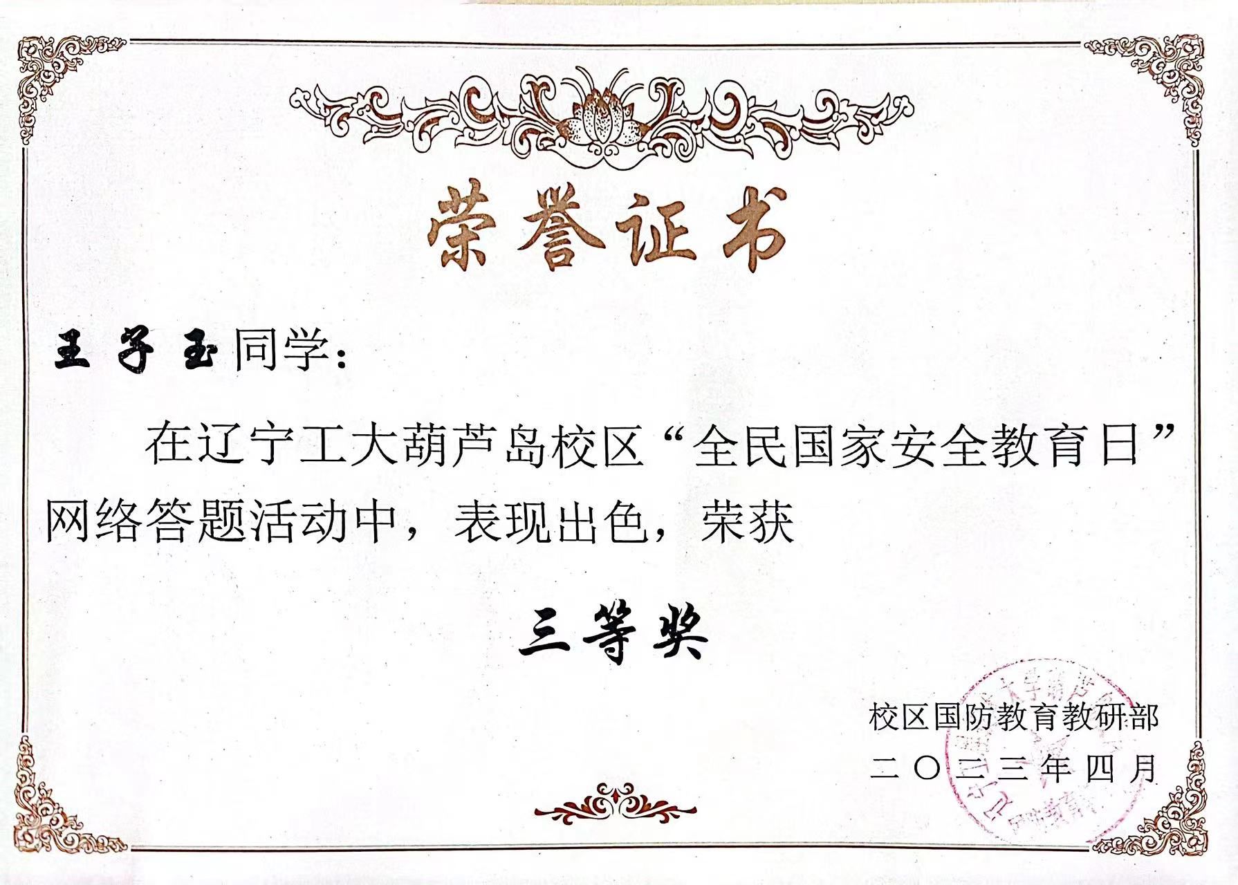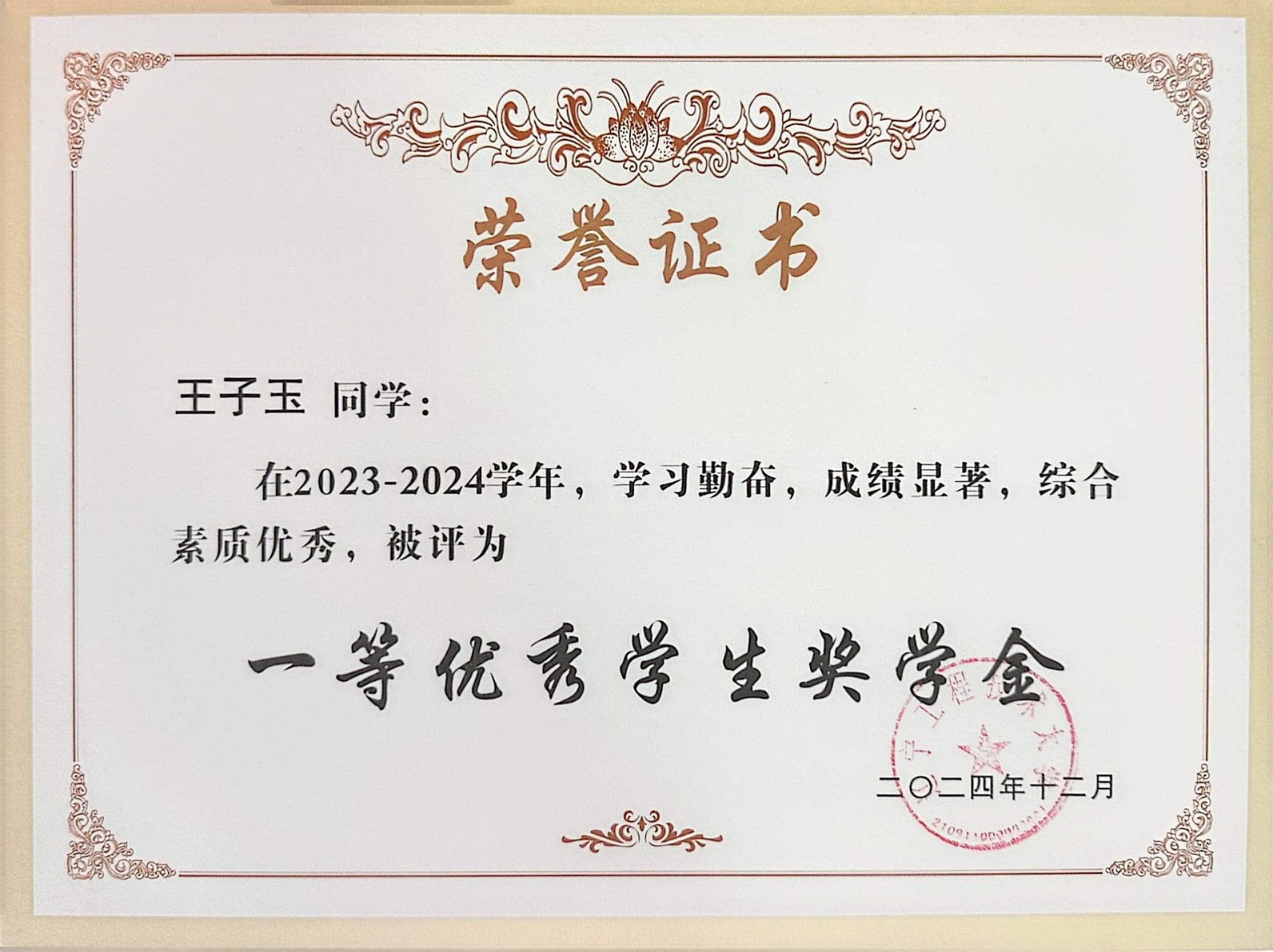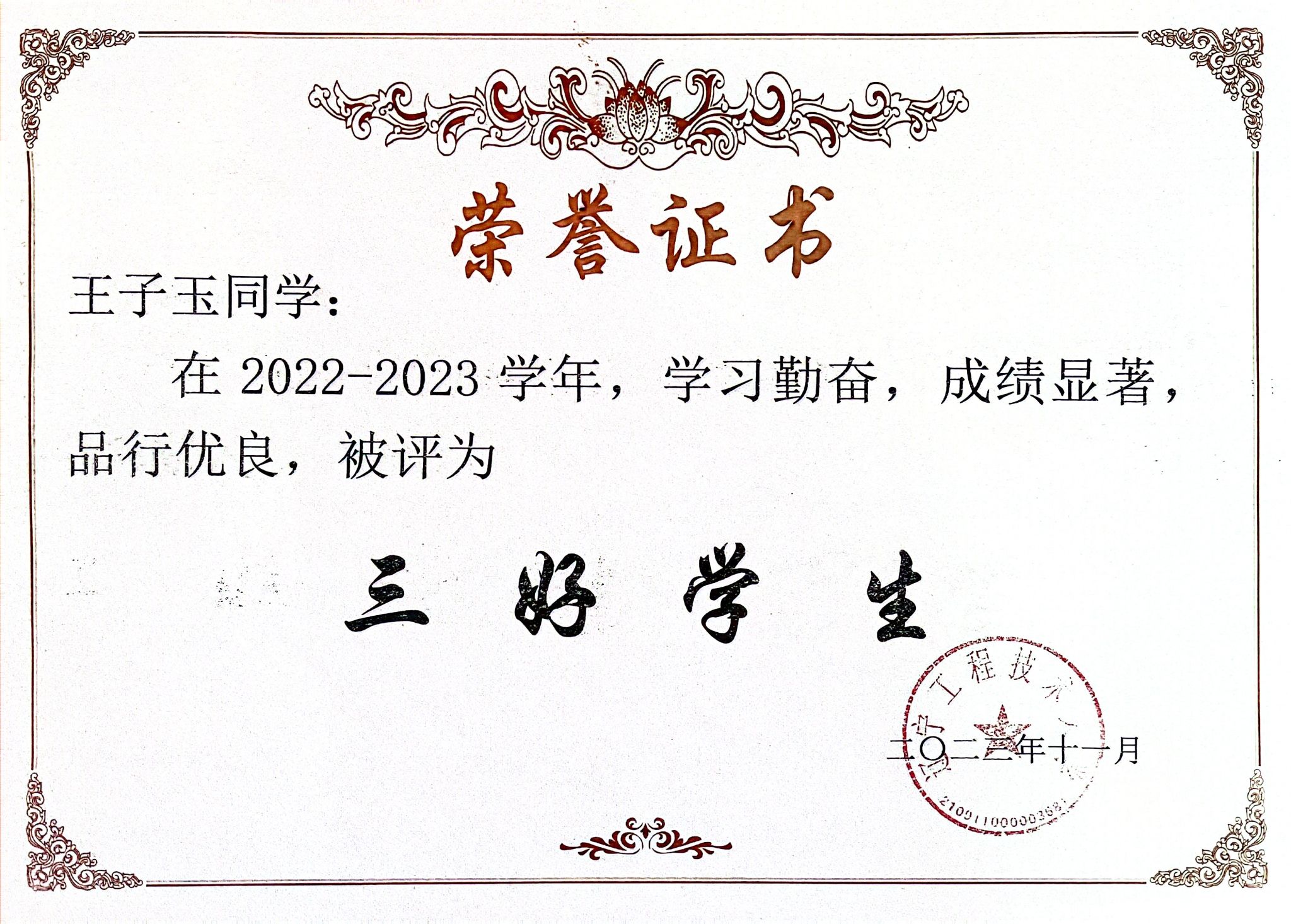 其他类:2023年,获得 “三好学生”荣誉称号;2023年,获得 “优秀团员”荣誉称号;2024年,获得 “三好学生”荣誉称号;2024年,获得 “进步之星”荣誉称号;2024年,获得 “辽宁省普通高等学校优秀毕业生”荣誉称号。