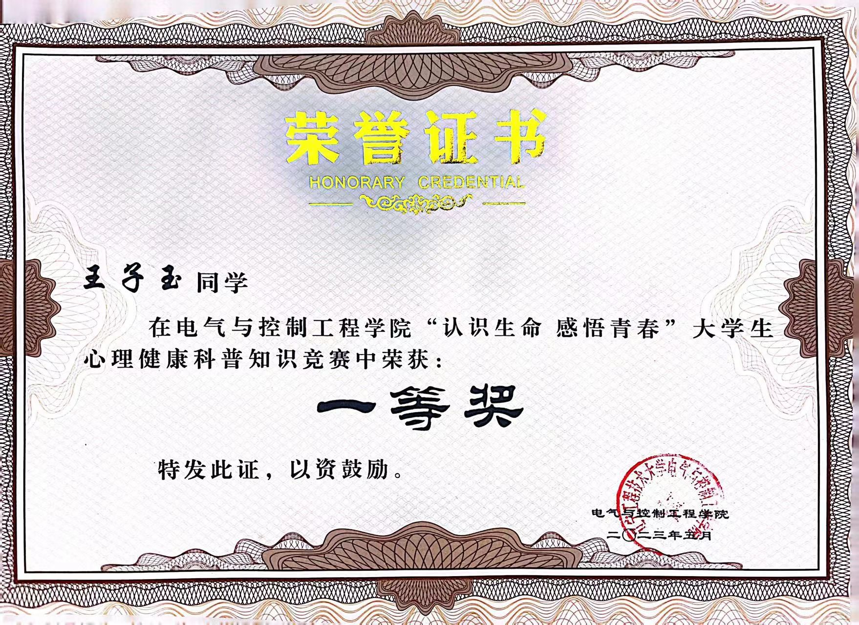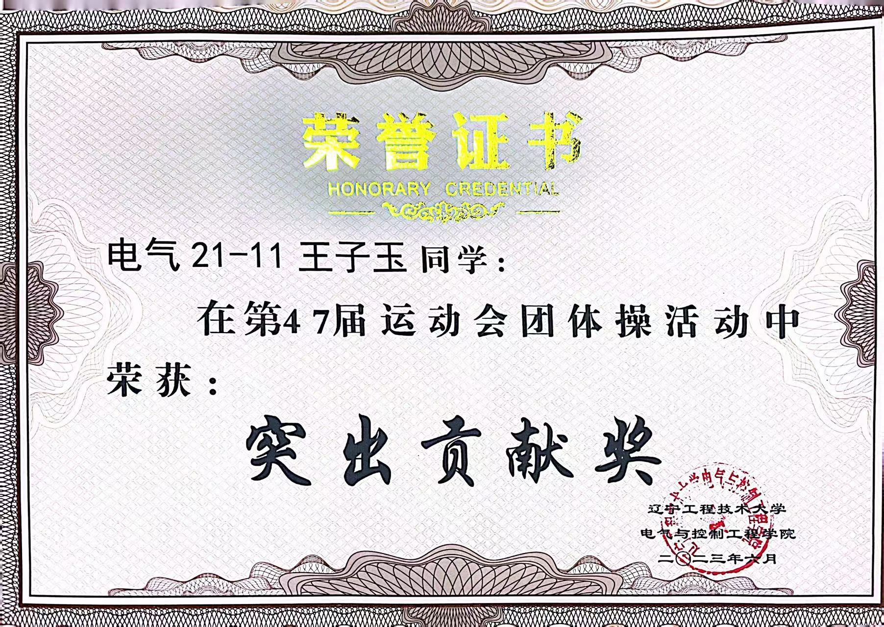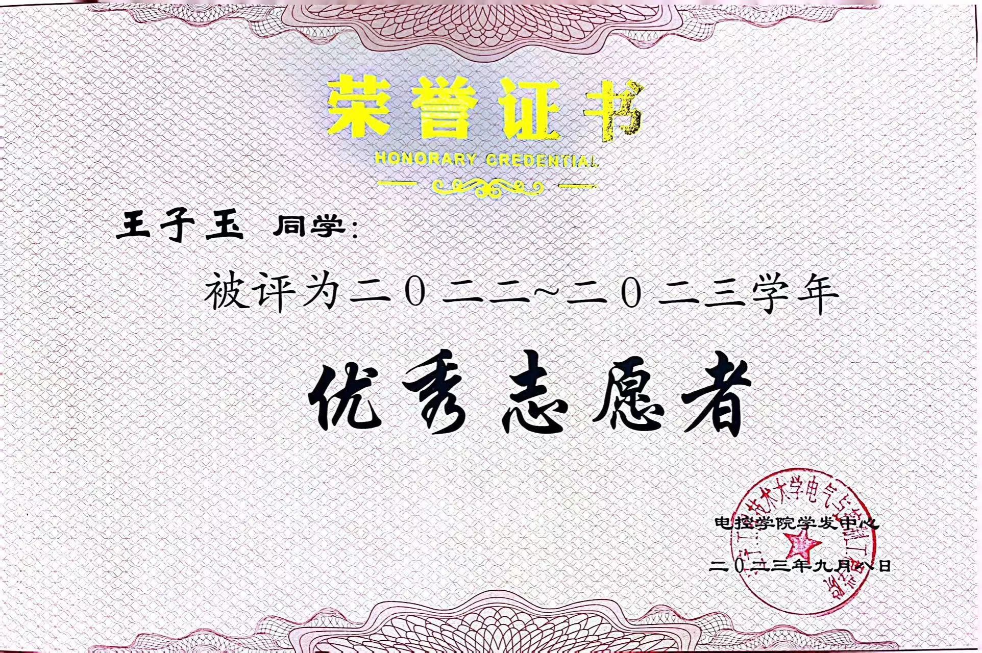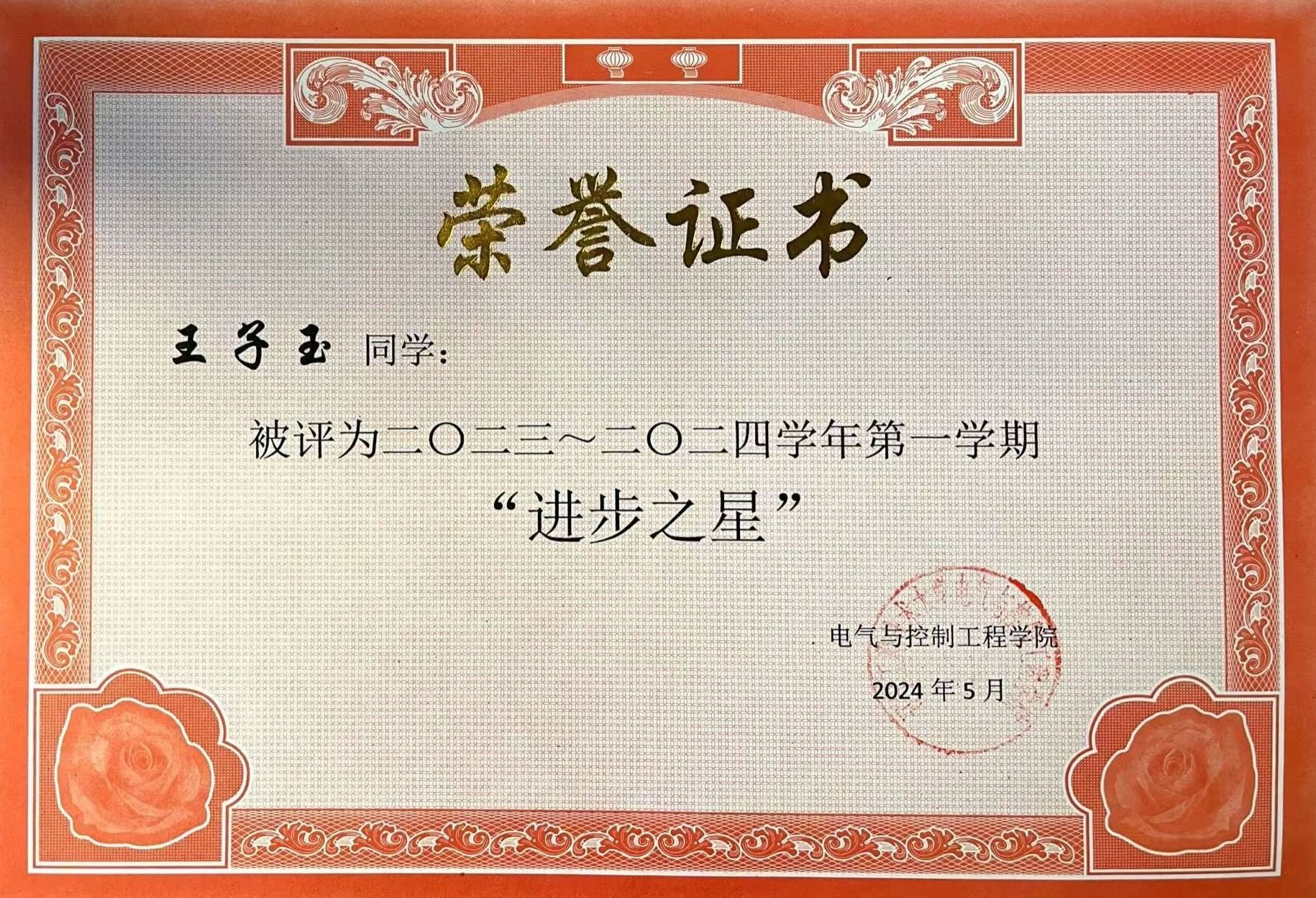 王子玉曾任电气21-11班学习委员,作为学习委员,兢兢业业,恪守职责。积极帮扶其他同学,帮忙巩固整理知识点,提升学业成绩。在学习上,因对知识怀敬畏之心,积极向老师请教问题,不断增加知识储备,提高学习能力,因此学习成绩优异。在生活方面,积极乐观,努力向上,经常帮助同学,带动他人更好地感受生活。在科研竞赛方面,不断提高自己的实践能力和创新才能,将所学知识运用到学科竞赛和科研项目中,收获颇丰。