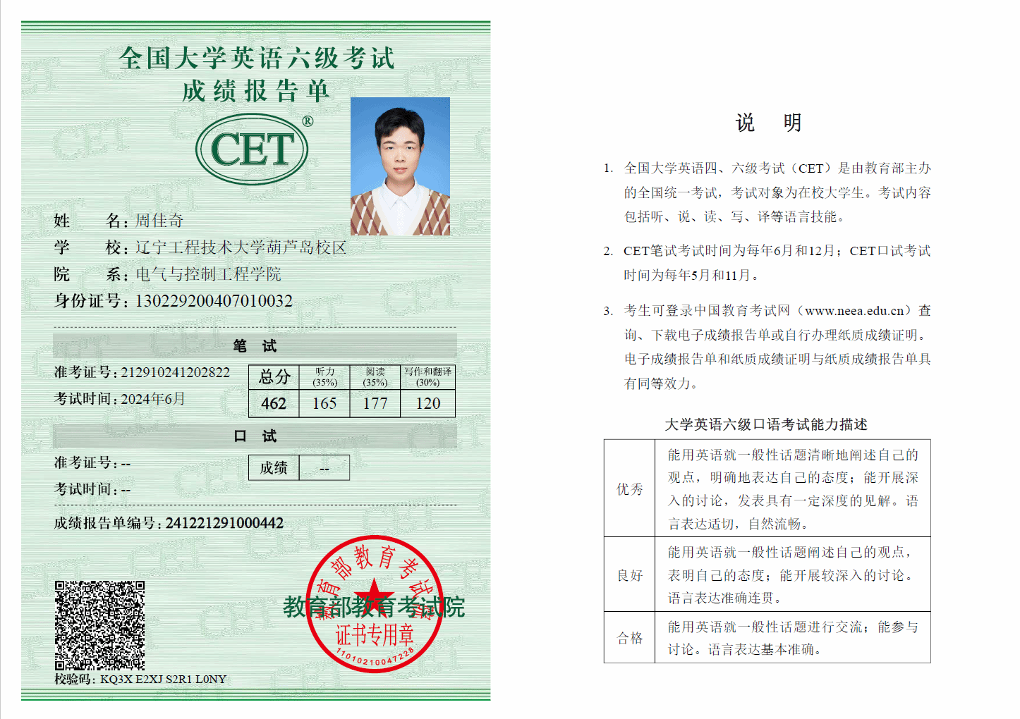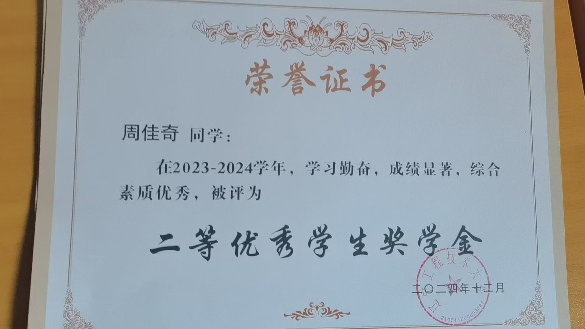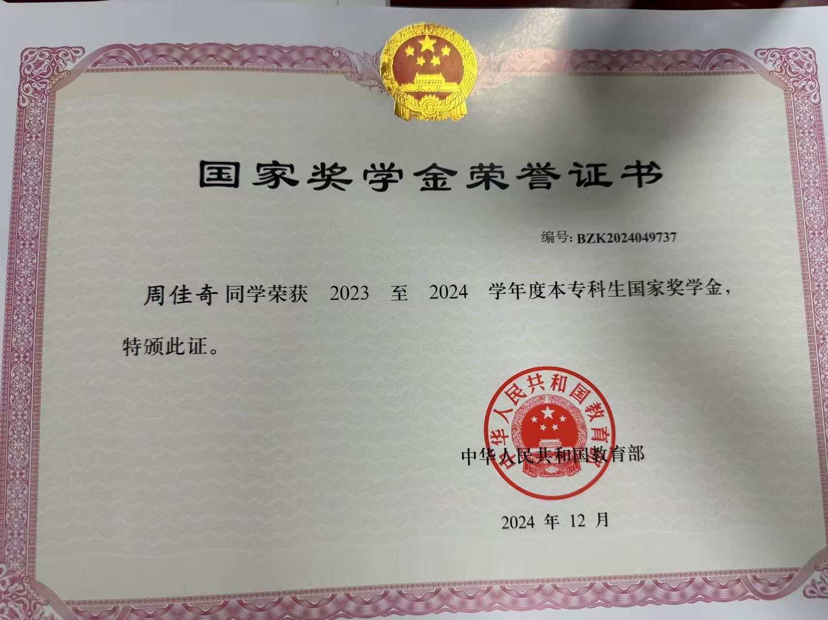 奖学金类:获得2023-2024学年国家奖学金,2022-2023学年校二等优秀学生奖学金;2023-2024学年校二等优秀学生奖学金,累计共获得国家、省、校级奖学金奖项3项。