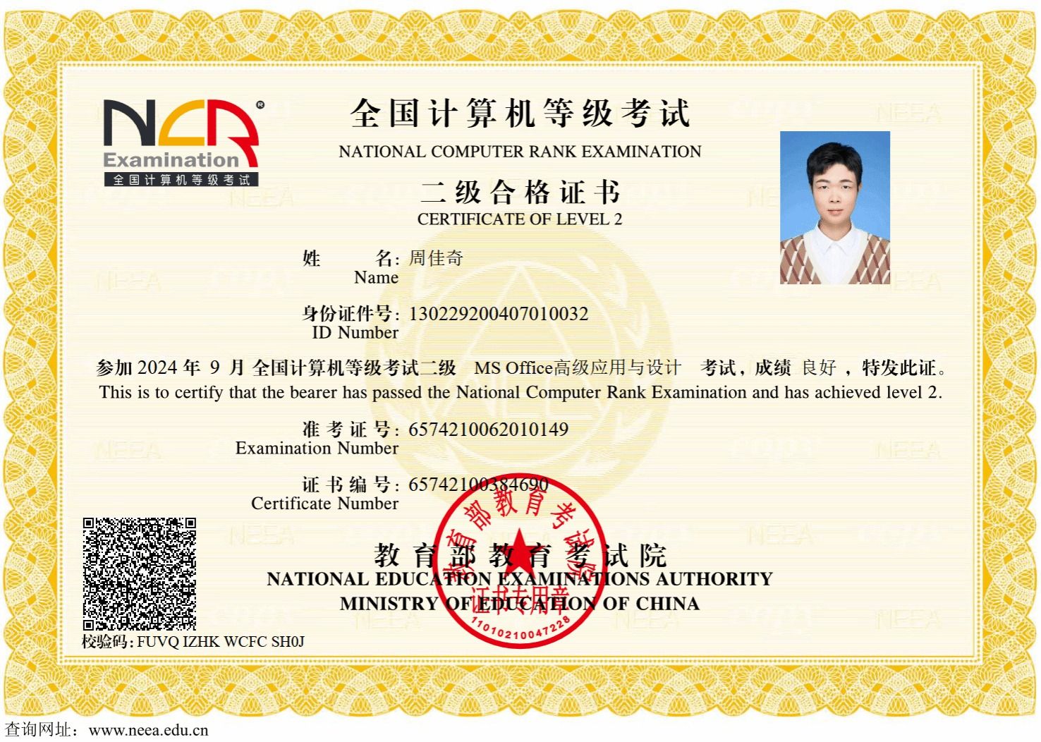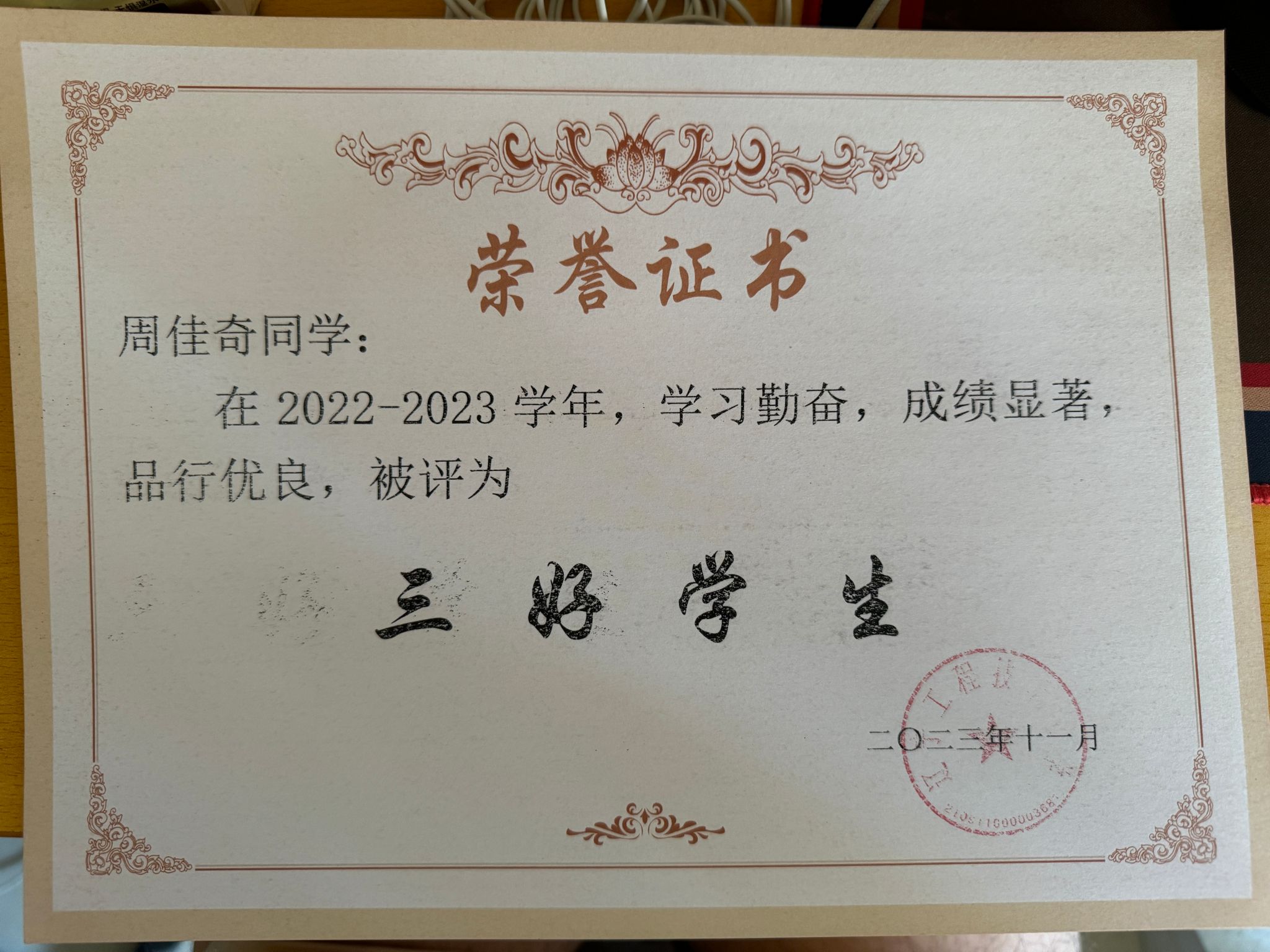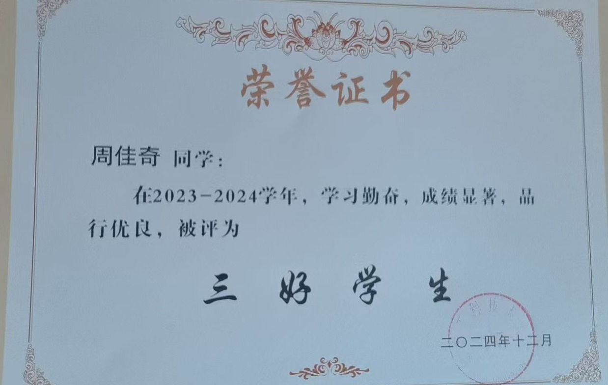 其他类:2023-2024学年度评为校级“三好学生”;2022-2023学年度评为校级“三好学生”;2022-2023学年度荣获校学生处“先进个人”。