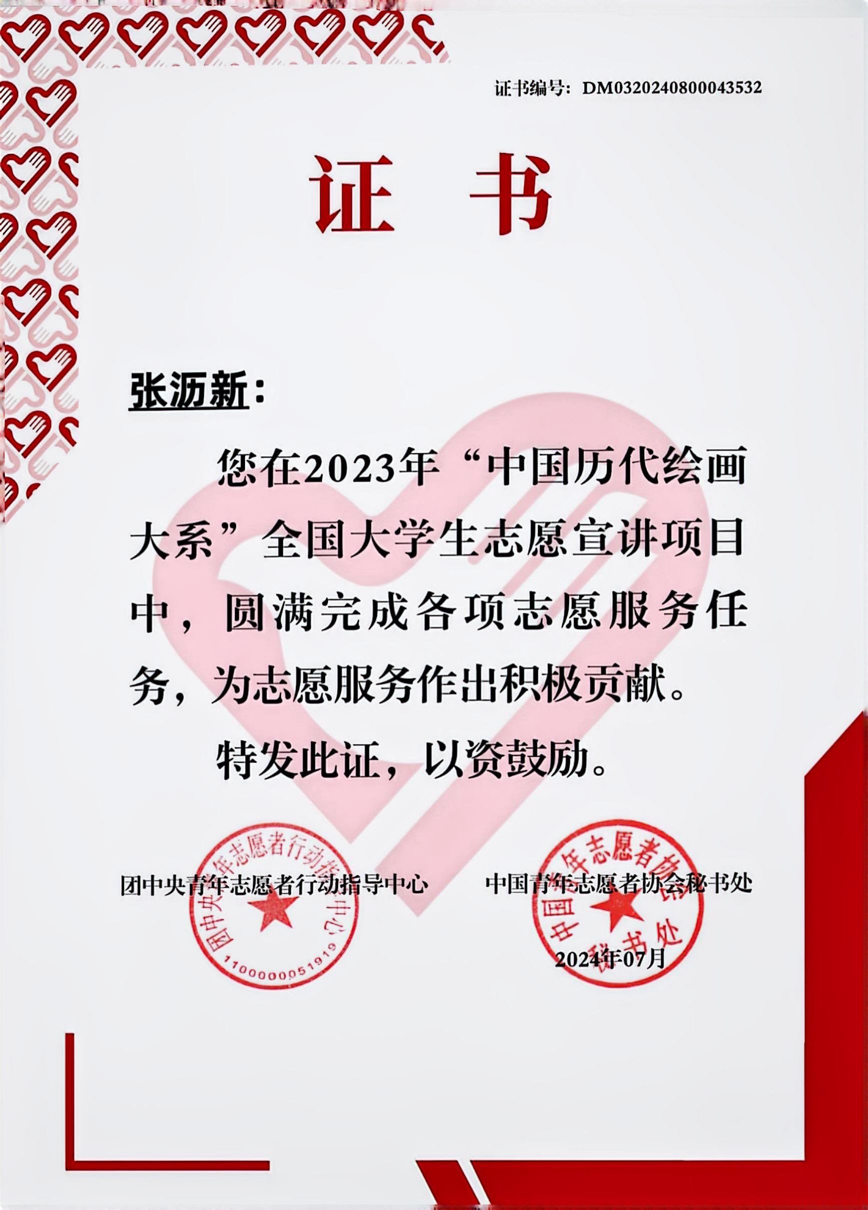 2023年,参加中国历代绘画大系志愿活动,获得“优秀志愿者”荣誉称号