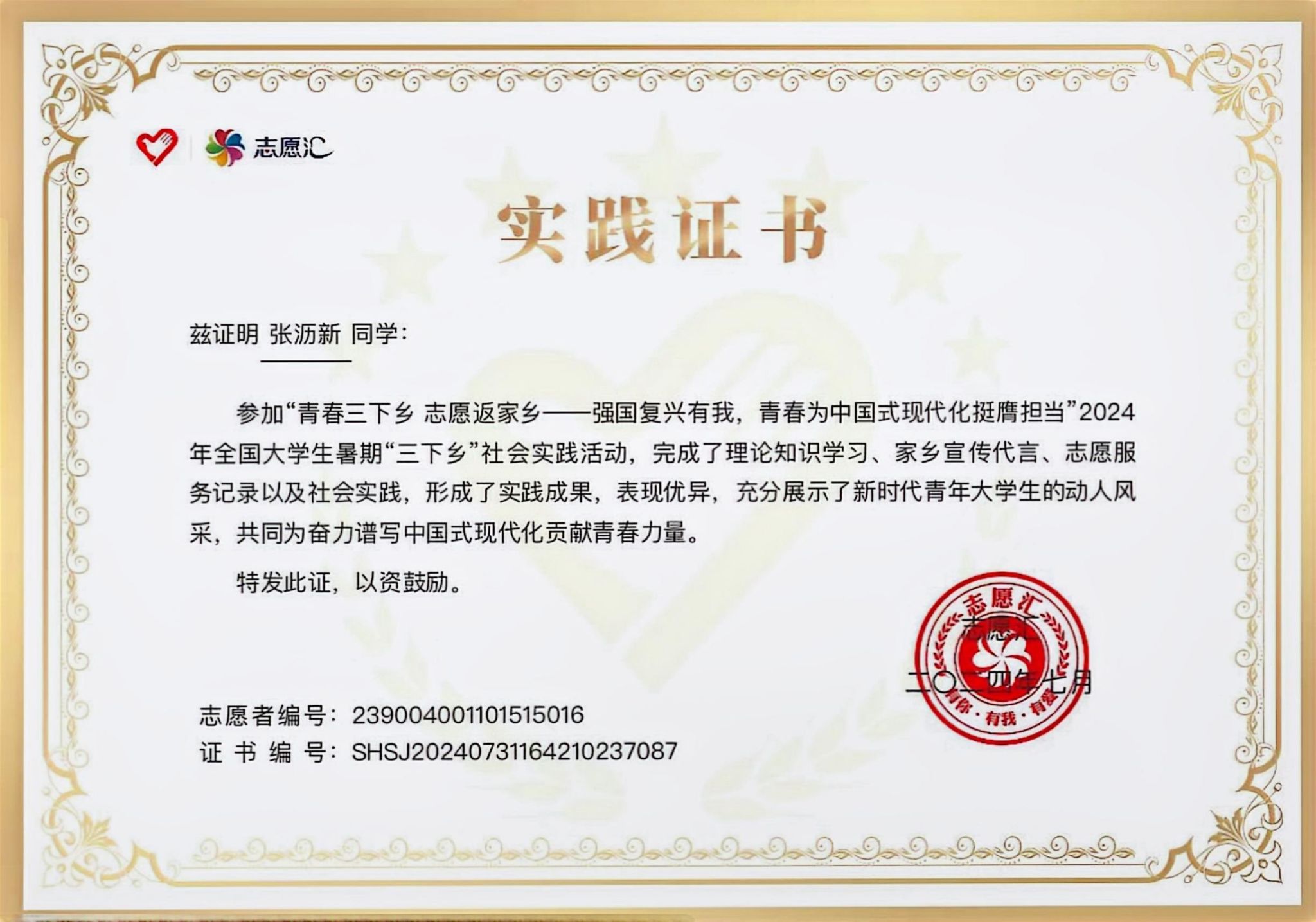 2024年,参加“青春三下乡 志愿返家乡——强国复兴有我,青春为中国式现代化挺膺担当”2024全国大学生暑期“三下乡”社会实践活动