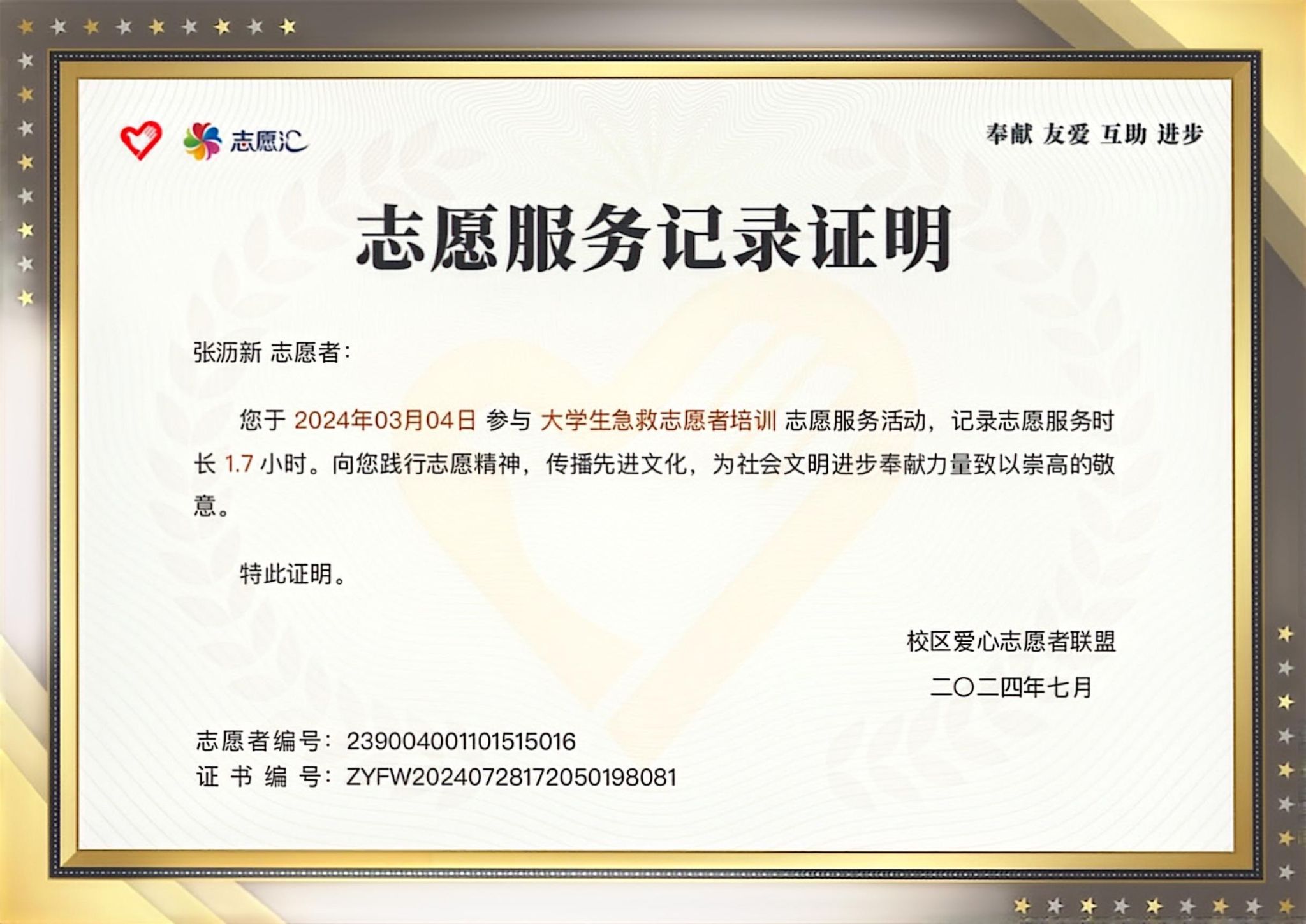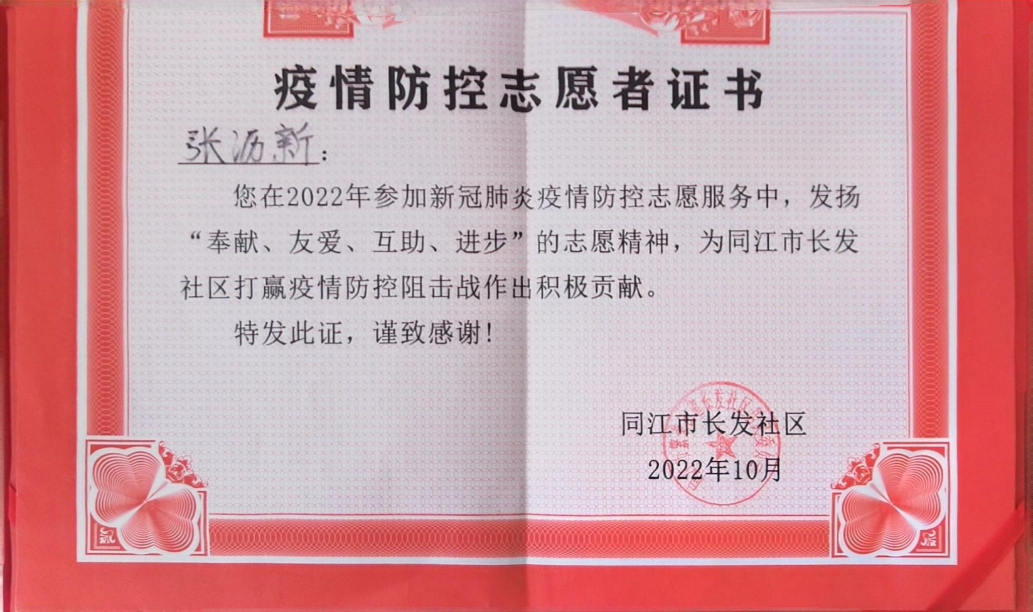 2022年,参加疫情防控活动,获得“优秀志愿者”荣誉称号