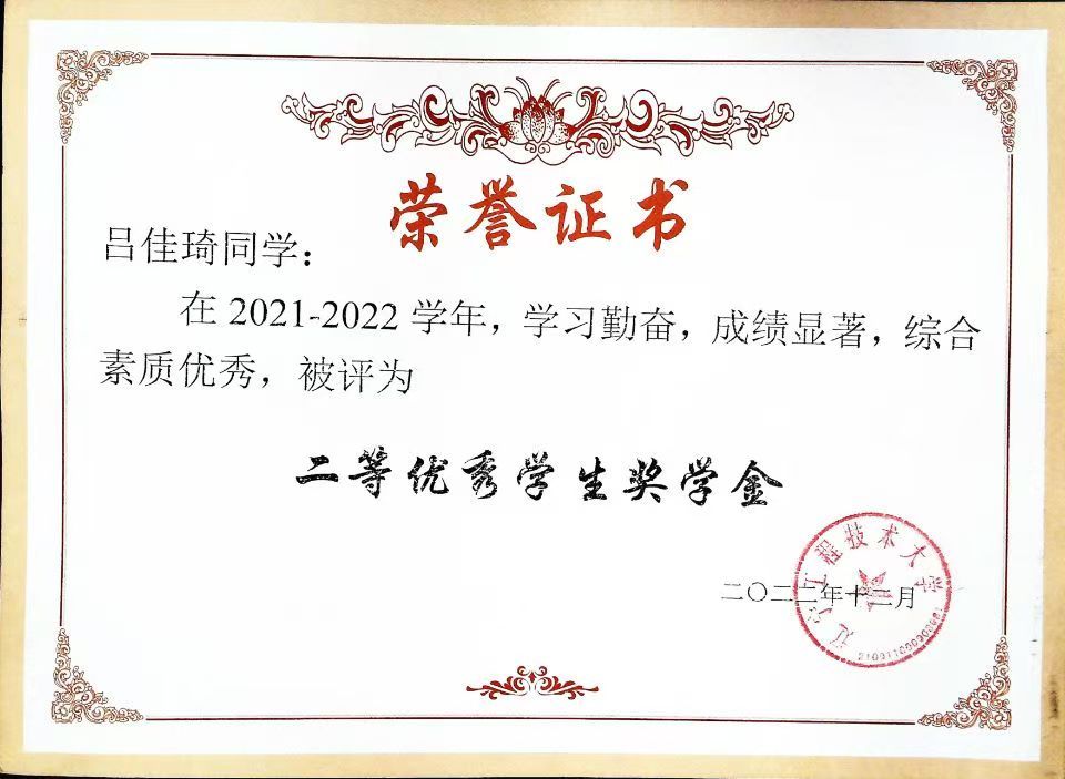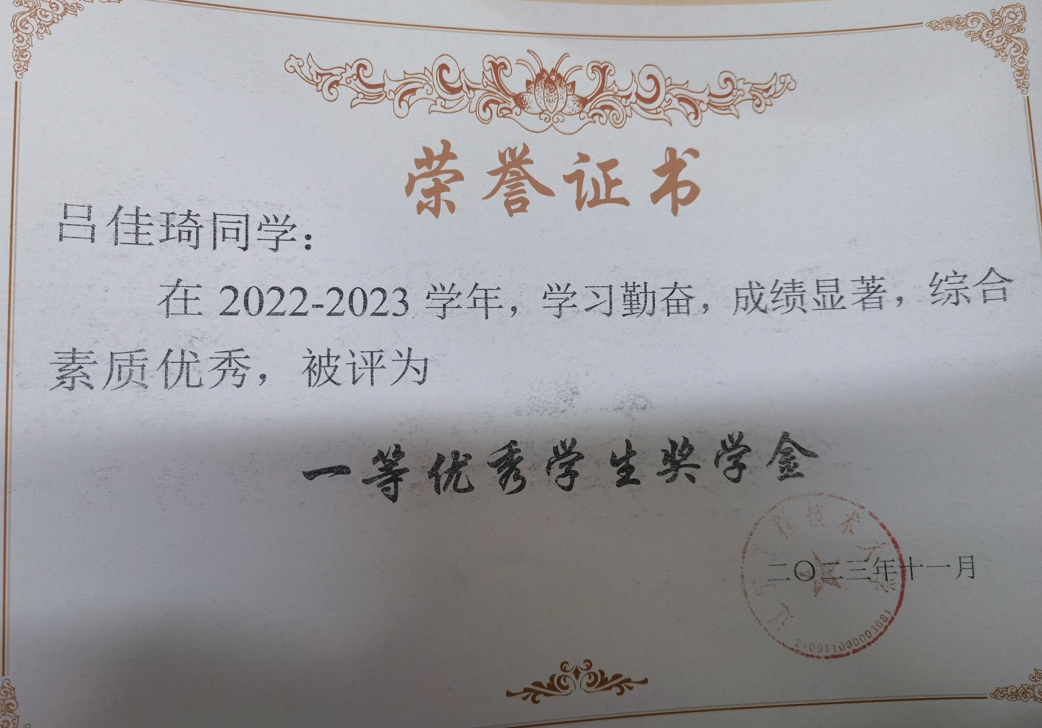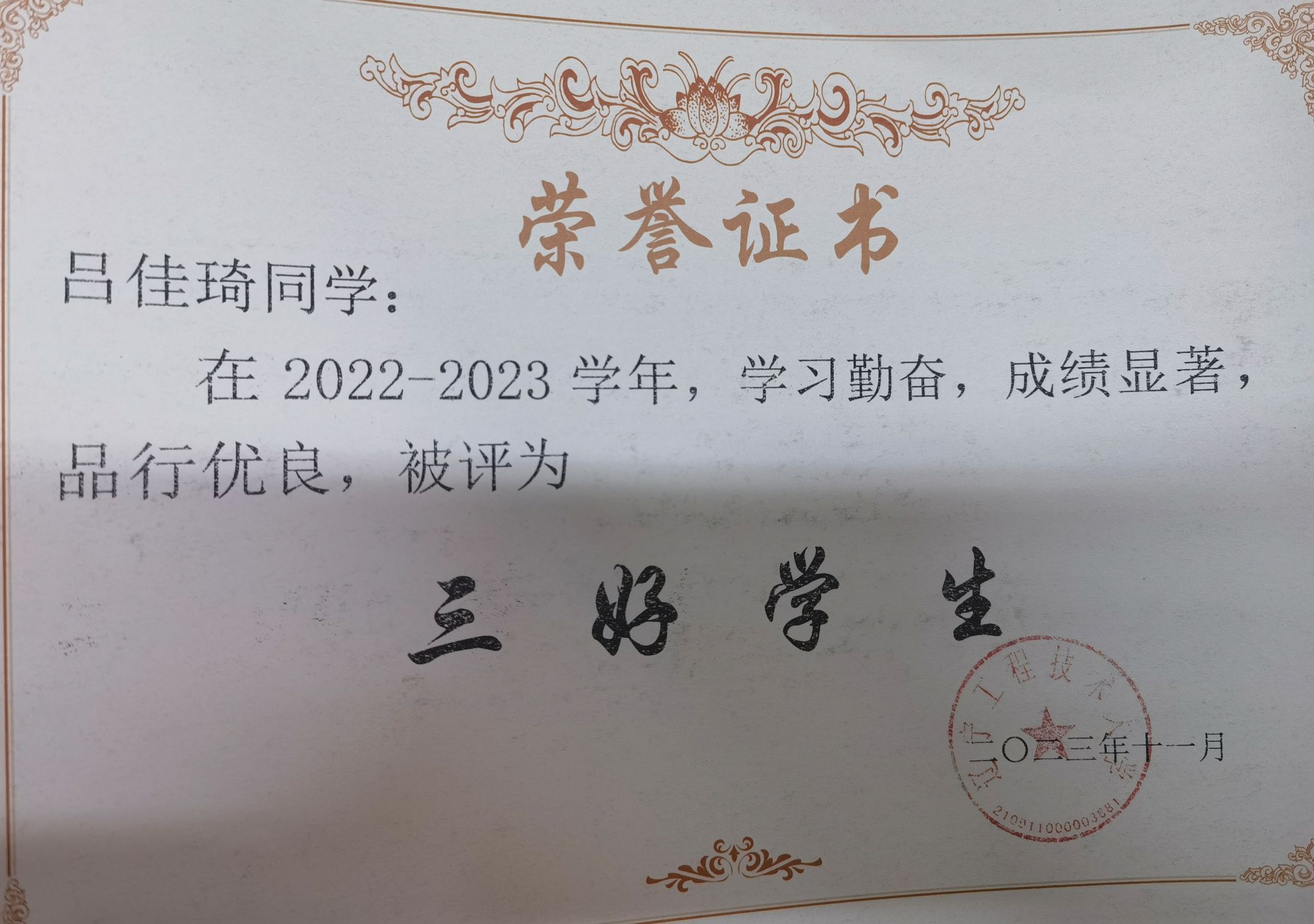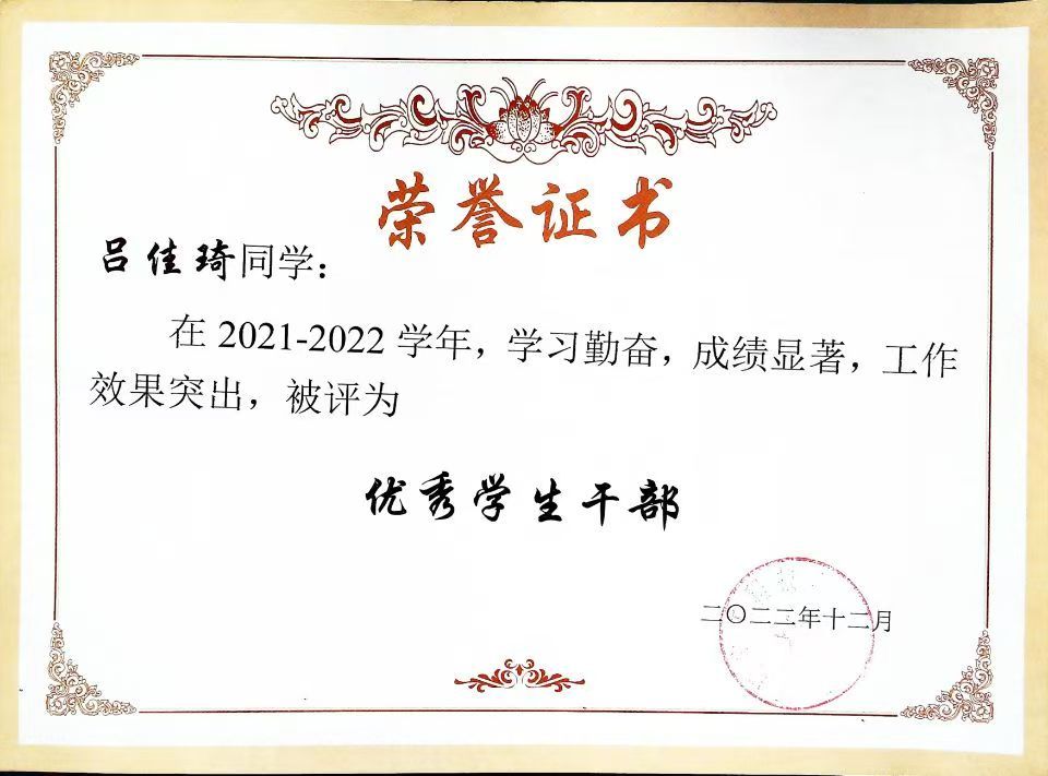 其他方面:获2021-2022年度“优秀学生干部”荣誉称号、获2022-2023年度校“三好学生”荣誉称号