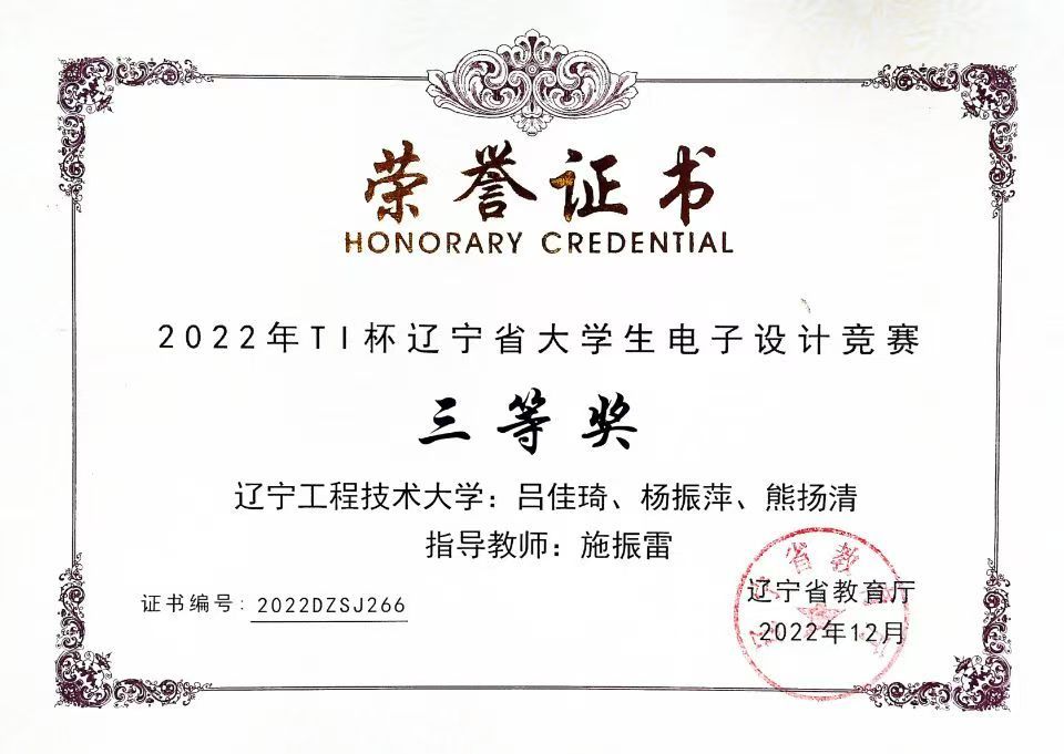 2 2022年T1杯辽宁省大学生电子设计竞赛 奖项:省级三等奖 指导教师:施振雷