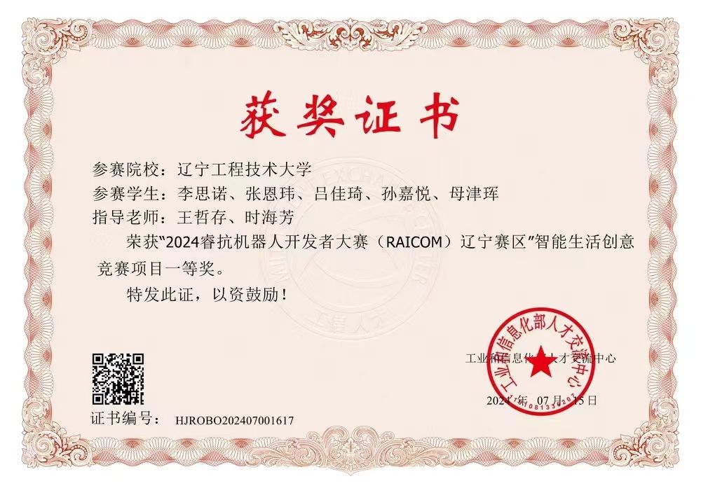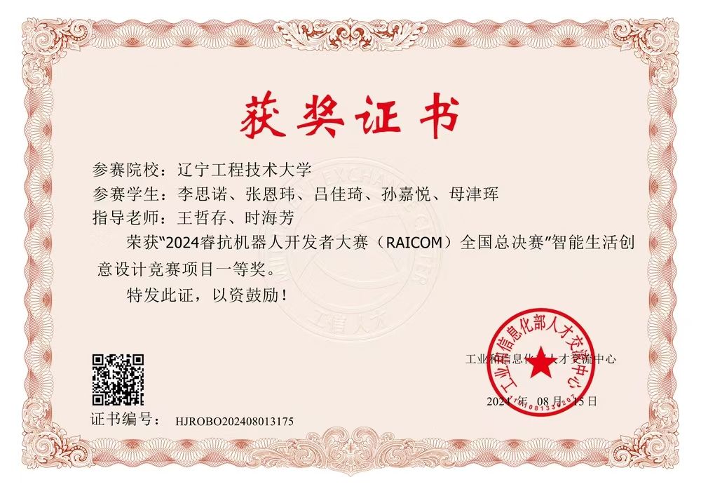 1 2024睿抗机器人开发者大赛智能生活创意竞赛 奖项:辽宁赛区一等奖、全国总决赛一等奖 指导教师:王哲存 时海芳