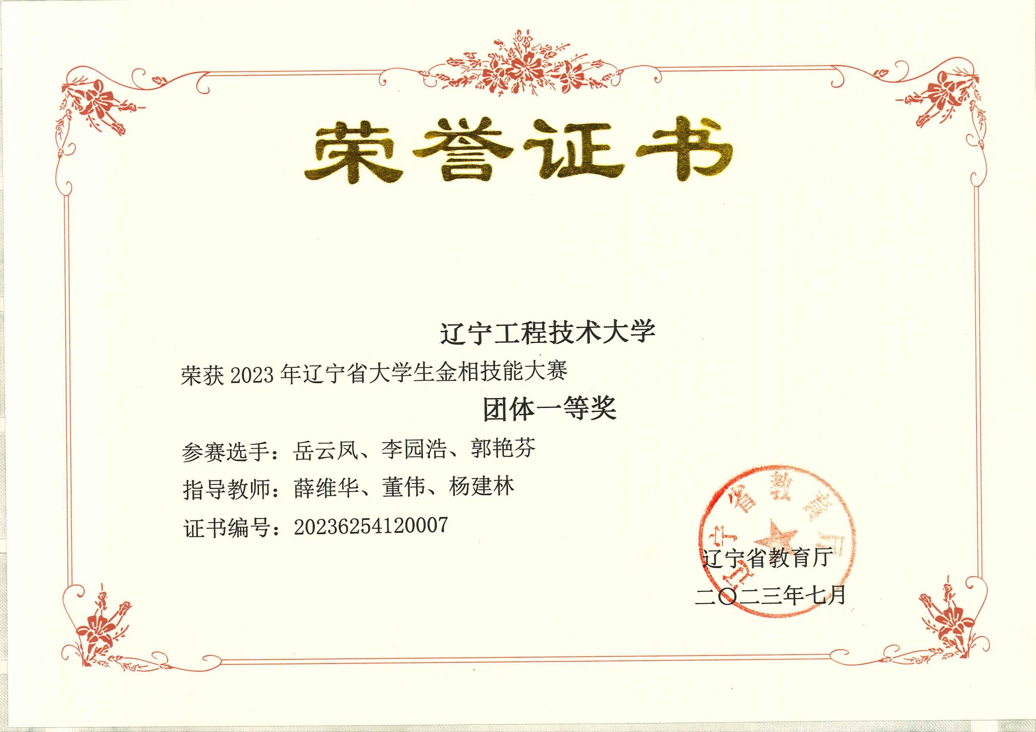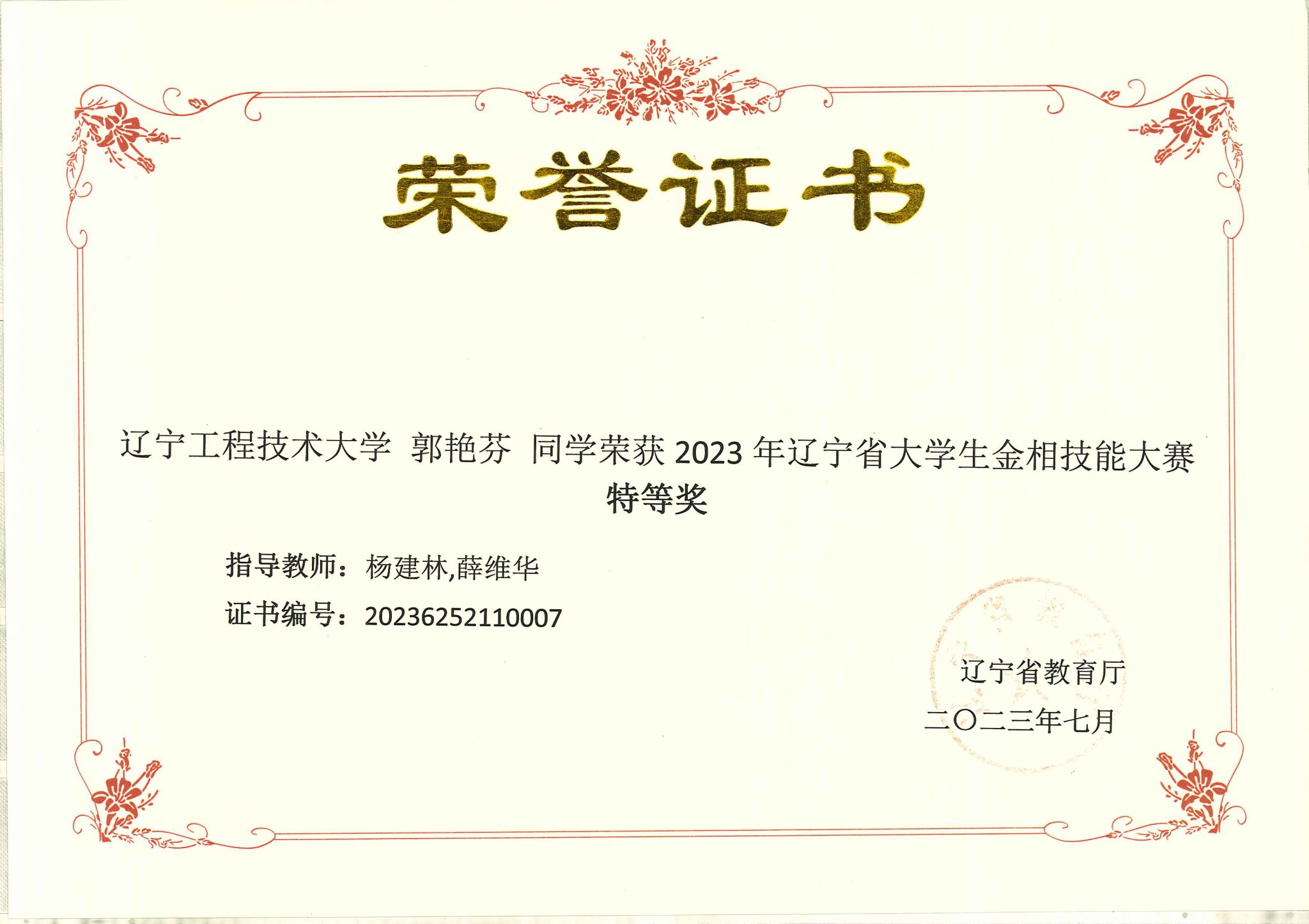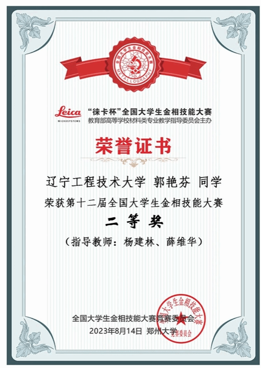 3 2023年辽宁省大学生金相技能大赛 奖项:省级特等奖 指导教师:杨建林、薛维华