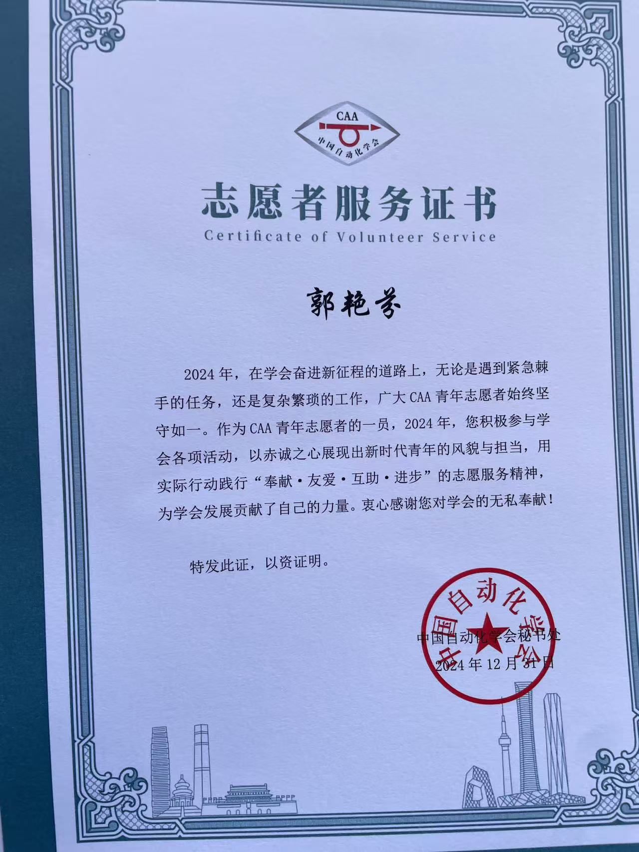 她在生活中积极向上、乐观开朗,关心同学、乐于助人、积极奉献自己的力量。学习上,她勤思苦学,努力学好每一门功课,有着良好的学习习惯和自学能力,在保持专业课成绩优异的同时砥砺深耕,积极参加科研竞赛,真正将理论运用于实践。志愿工作上,她担任校爱爱视频融媒体中心副台长,为学校的宣传工作贡献了自己的一份力量。除此之外,“做一个对国家、对社会、对他人有用的人”一直是她的奋斗目标,学习之余她积极参加各项志愿服务和实践活动,回报社会,服务社会。