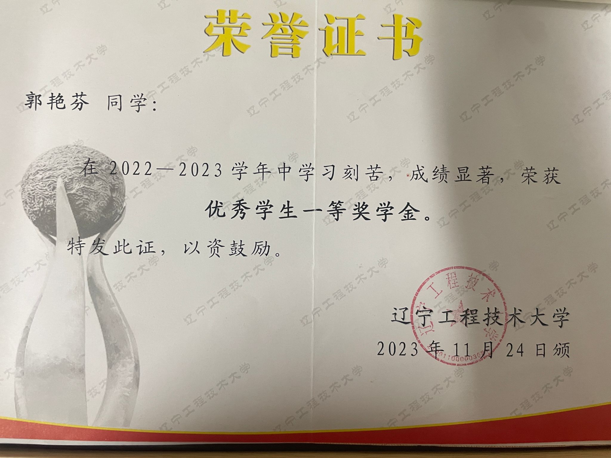 奖学金类:累计获得国家、省、校级奖项3项。(两次校一等优秀学生奖学金,一次国家奖学金);